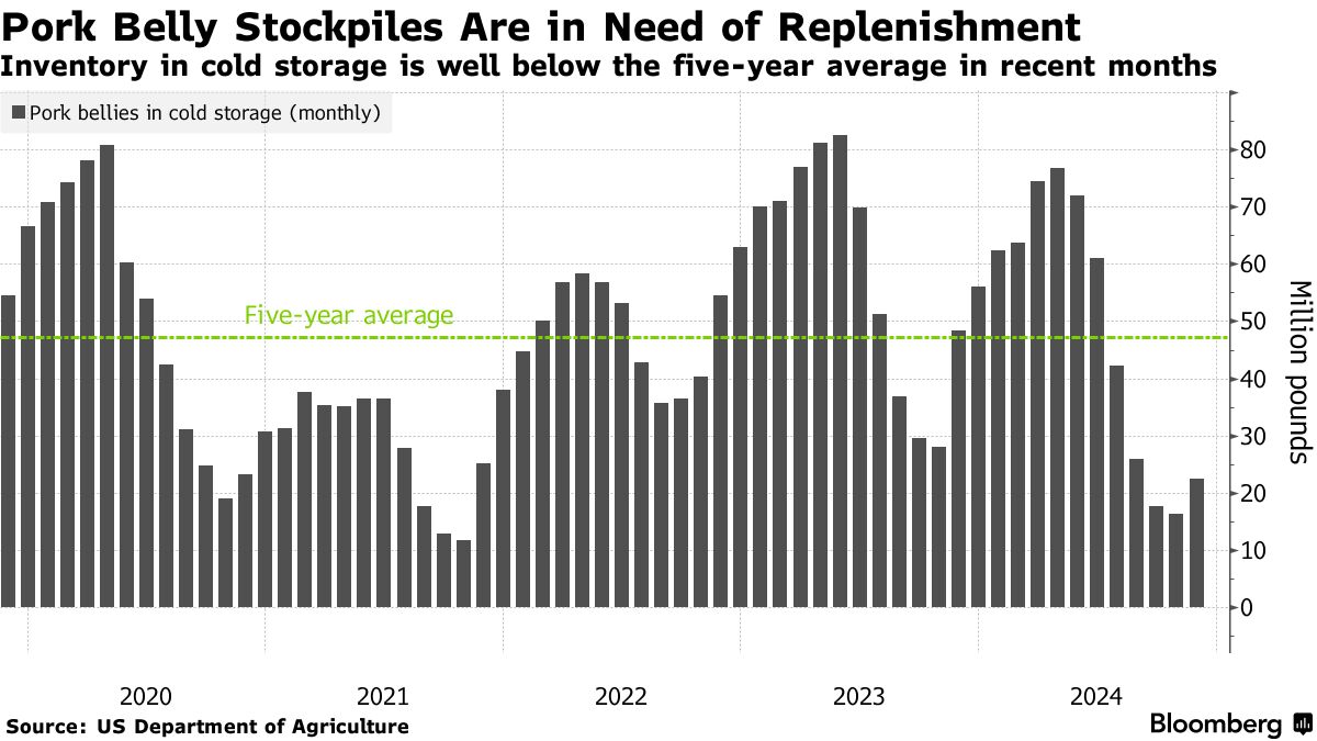 美国冷藏猪肉肚的库存,作为制作培根的切割部位,趋势低于平均水平。对这种受欢迎的早餐肉和汉堡配料的需求如此强劲,以至于供应可能在历史上通常会在未来几个月增加的时刻收缩,正值夏季销售高峰期之前。交易商将关注美国农业部在1月24日发布的每月冷藏报告,以获取关于猪肉需求以及其他肉类、乳制品、禽类、水果和蔬菜的最新信息。