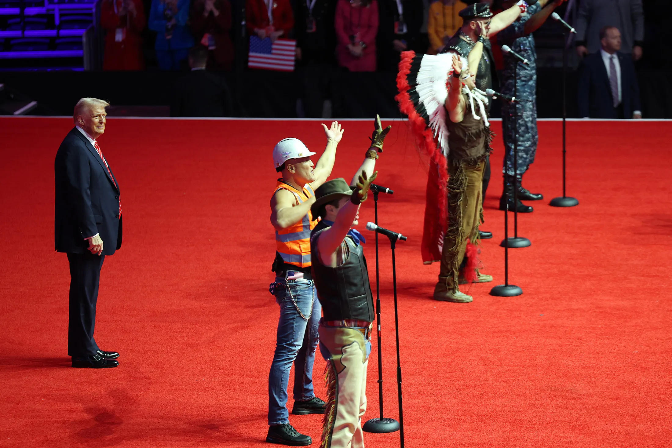 活动的演讲者和表演者包括音乐家基德·洛克、演员乔恩·沃伊特,以及终极格斗冠军赛的首席执行官达纳·怀特,而亿万富翁支持者埃隆·马斯克则与当选总统同台。