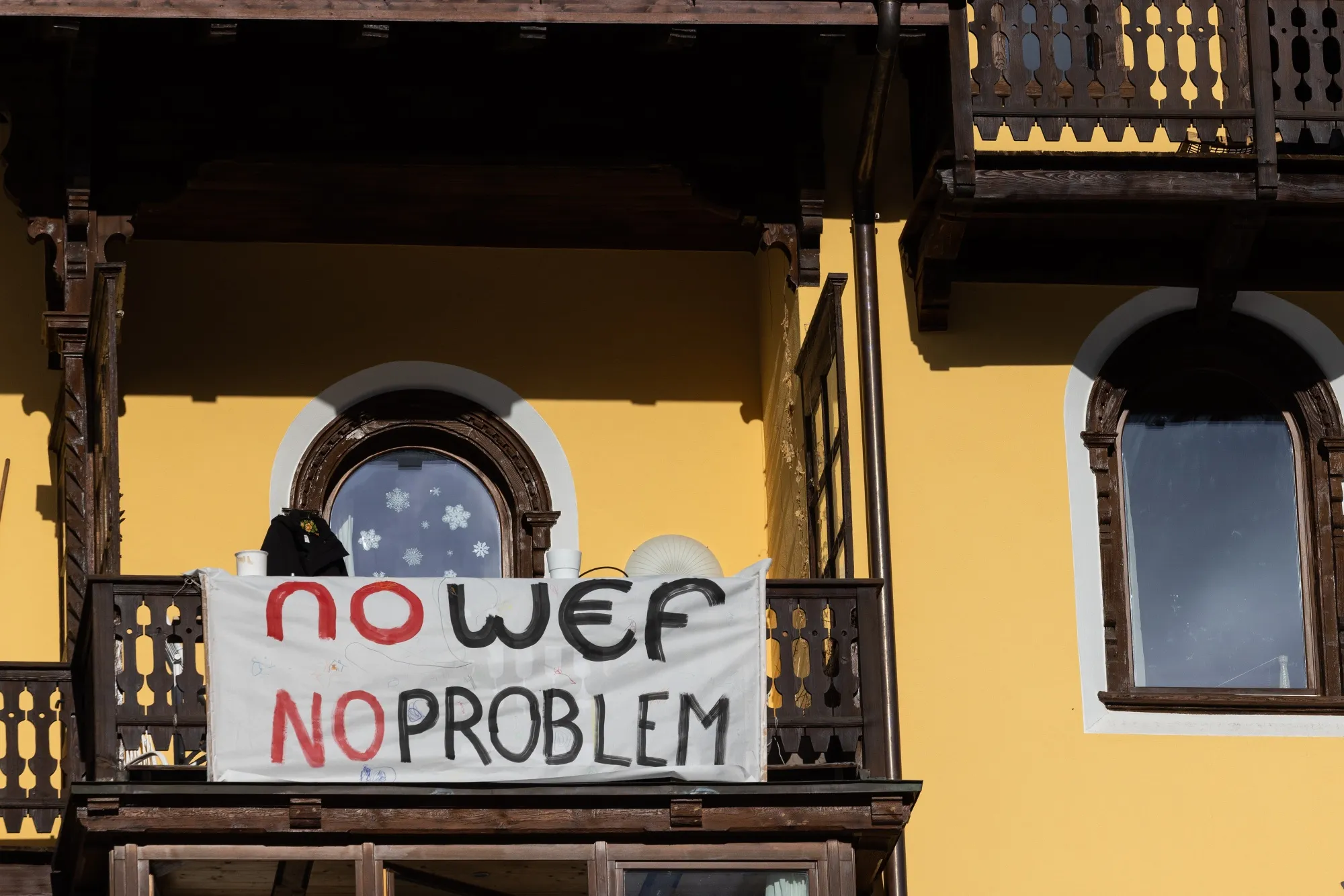 在瑞士达沃斯世界经济论坛召开前,一个反对世界经济论坛的横幅悬挂在阳台上。