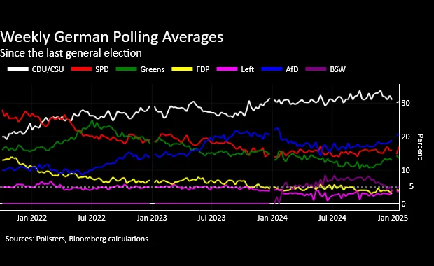 目前看来,梅尔茨的基督教民主联盟/基督教社会联盟(CDU/CSU)大约领先30%,可能需要绿党或肖尔茨的社会民主党(SPD)——或者可能两者都需要——才能确保议会多数。