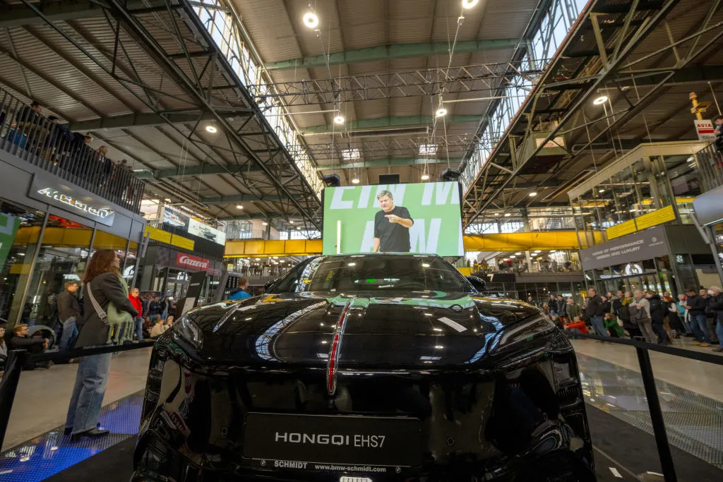 哈贝克在1月18日慕尼黑的绿党竞选活动中投影在屏幕上。来源:图片联盟/盖蒂图片社一个充满了耗油的布加迪、保时捷和法拉利——甚至还有一辆中国红旗的汽车爱好者圣地——对于德国绿党来说,是一个不寻常的选举集会场所。