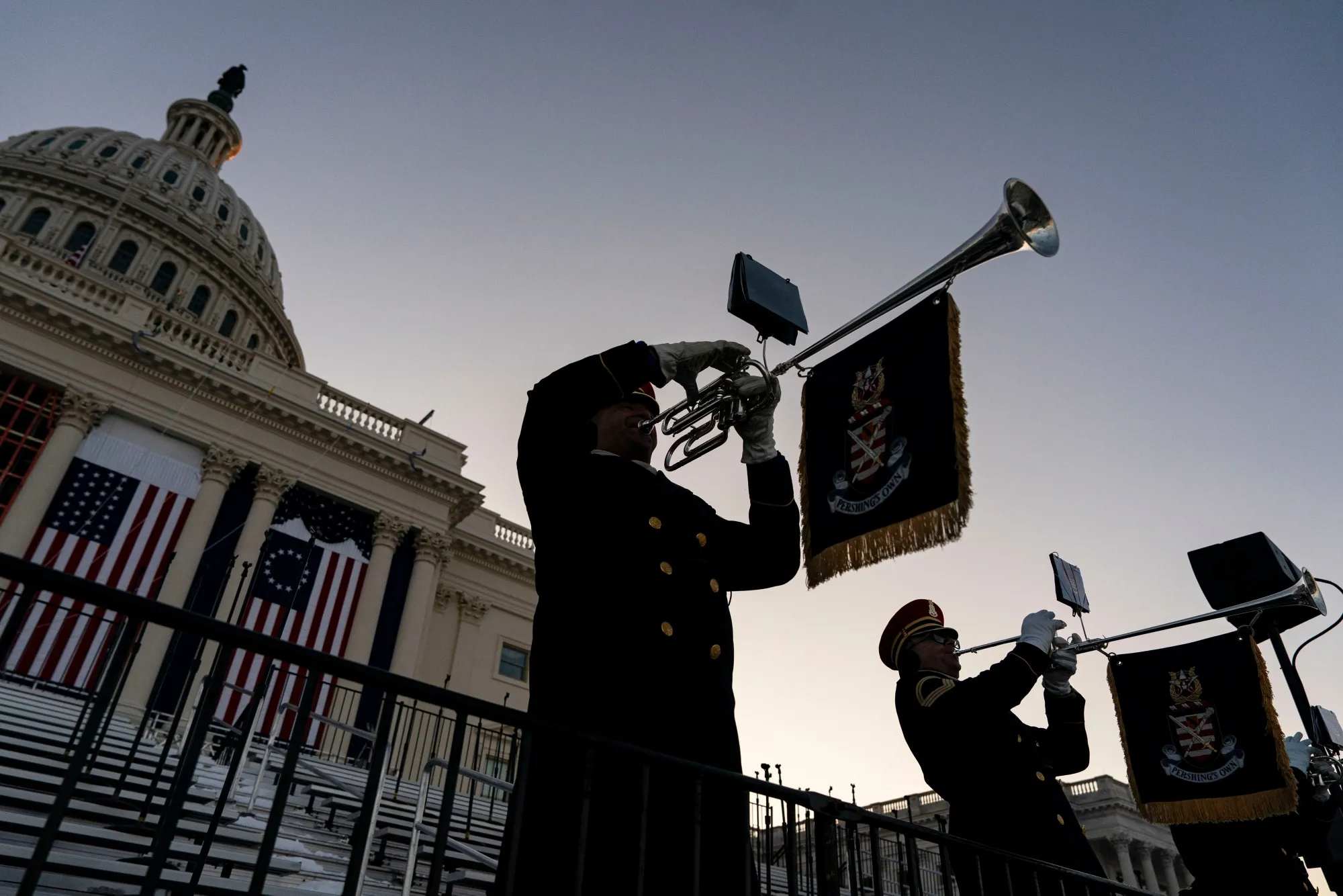 美国陆军乐队“佩尔辛的乐队”成员正在为特朗普的总统就职典礼排练。摄影师:阿尔·德拉戈/彭博社特朗普的宣誓就职和演讲只是为期多天的就职庆祝活动的一部分,其中包括访问阿灵顿国家公墓、在国家建筑博物馆为捐赠者举办晚宴、在白宫喝茶以及周一晚上在华盛顿联合车站举行的正式舞会。