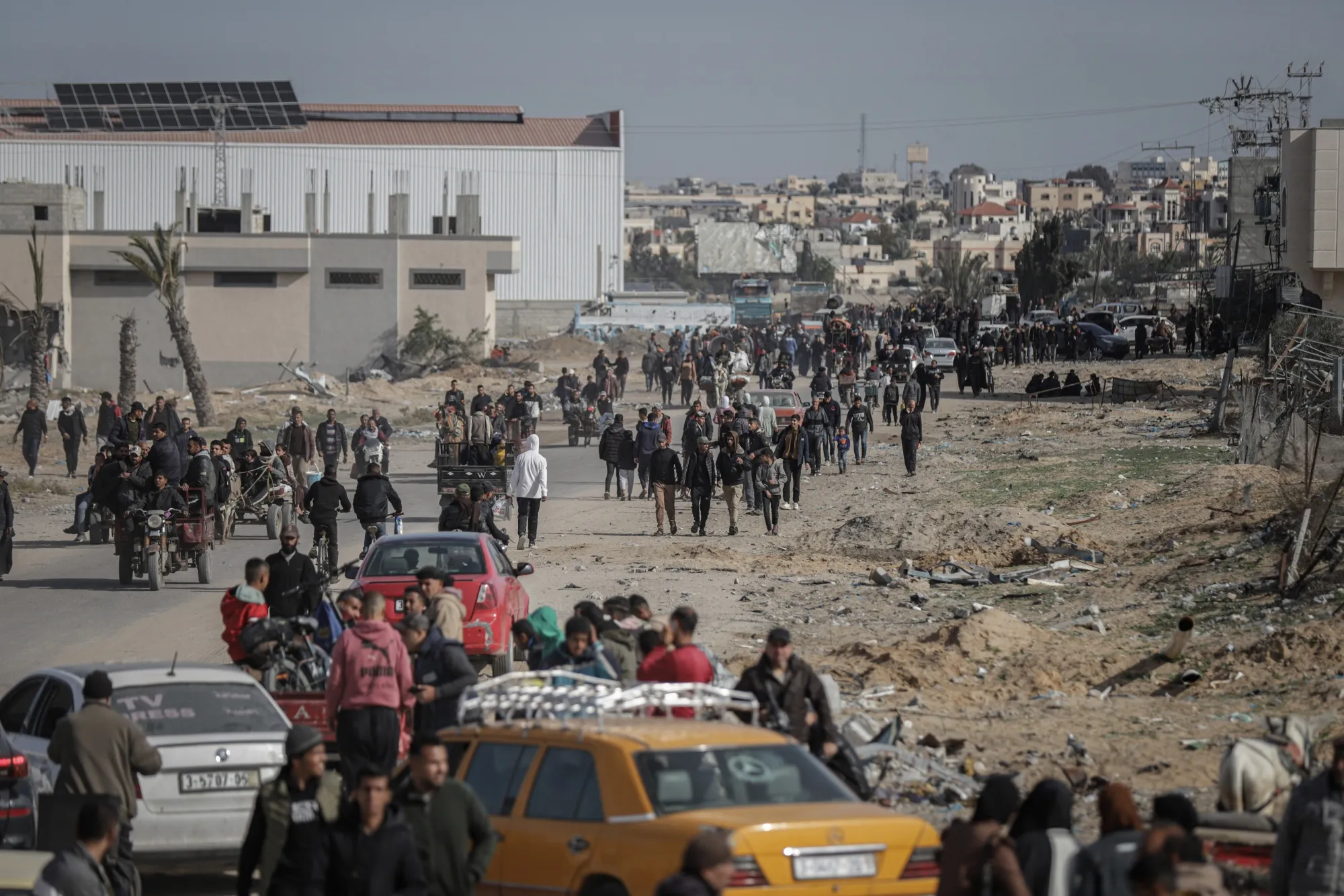 巴勒斯坦人在停火开始后返回家园,地点:拉法,日期:1月19日。摄影师:阿赫迈德·萨利姆/彭博社加沙停火已进入第二天,数百辆救援卡车在首次人质与囚犯交换后获准进入战火 ravaged 的地区。