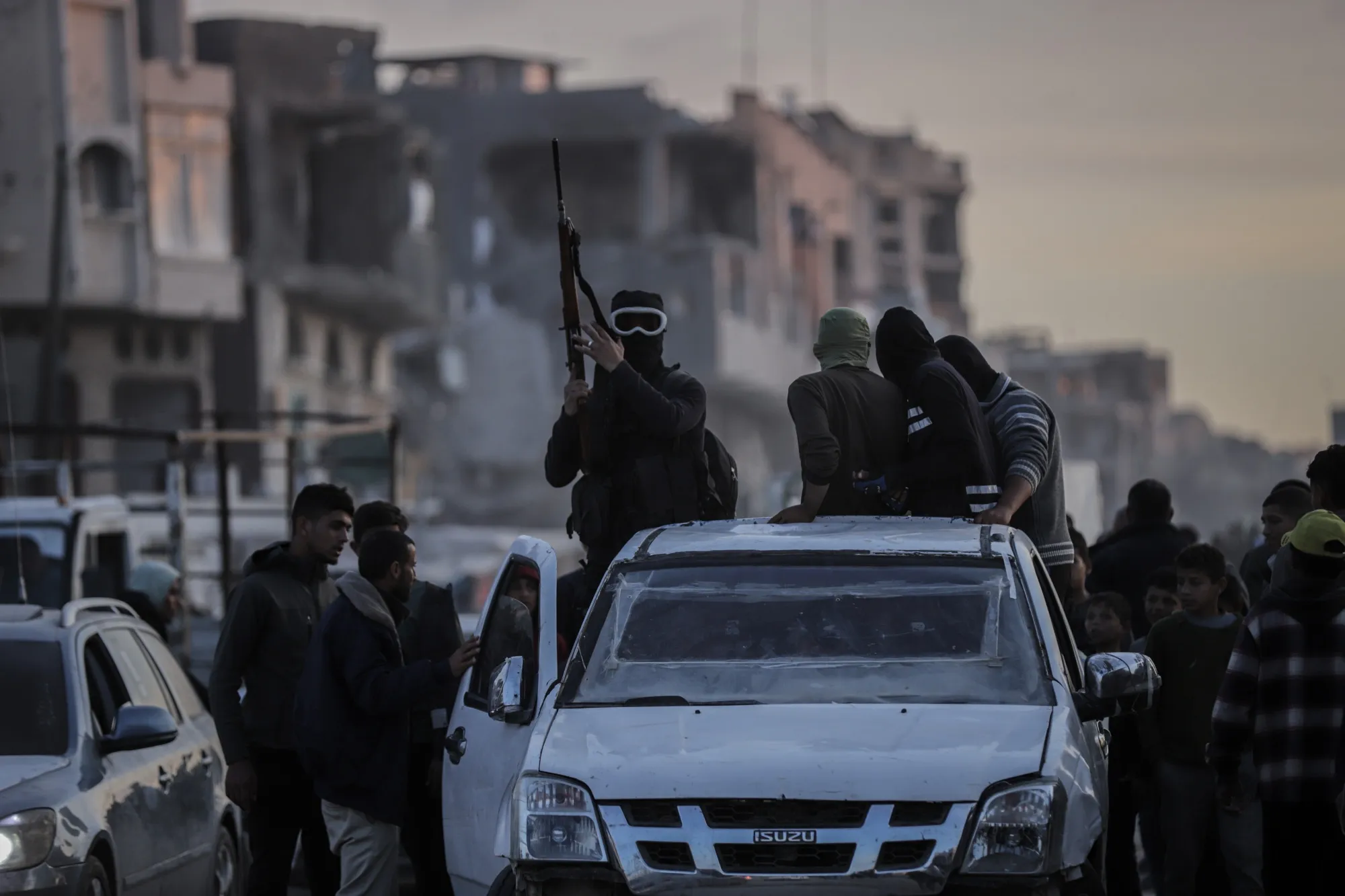 哈马斯战士护送红十字会车辆前往收集在停火协议后释放的以色列人质,地点在加沙城,日期为1月19日。摄影师:阿布德·阿布萨拉马/法新社/盖蒂图片社如果那发生的话,将有超过60名人质仍然被拘留,这让许多以色列人表示他们无法容忍。