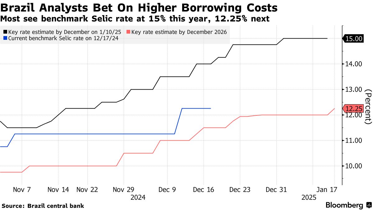 基准 Selic 利率预计将在2026年12月达到12.25%,高于之前预测的12%,根据周一发布的中央银行经济学家周报。大多数分析师预计,今年年底的借贷成本将达到15%。