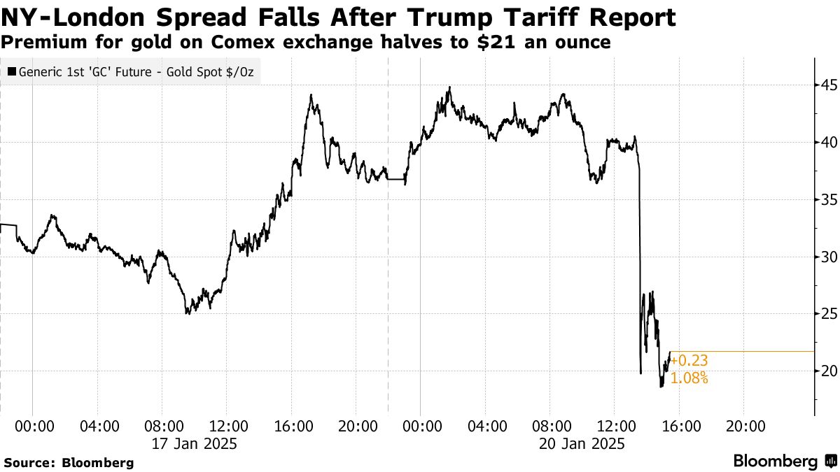 黄金期货在纽约的Comex交易所下跌。近期,黄金、白银和其他可在美国交付的金属的溢价已超过其他国际基准,因为投资者为金属关税的可能性做好准备。