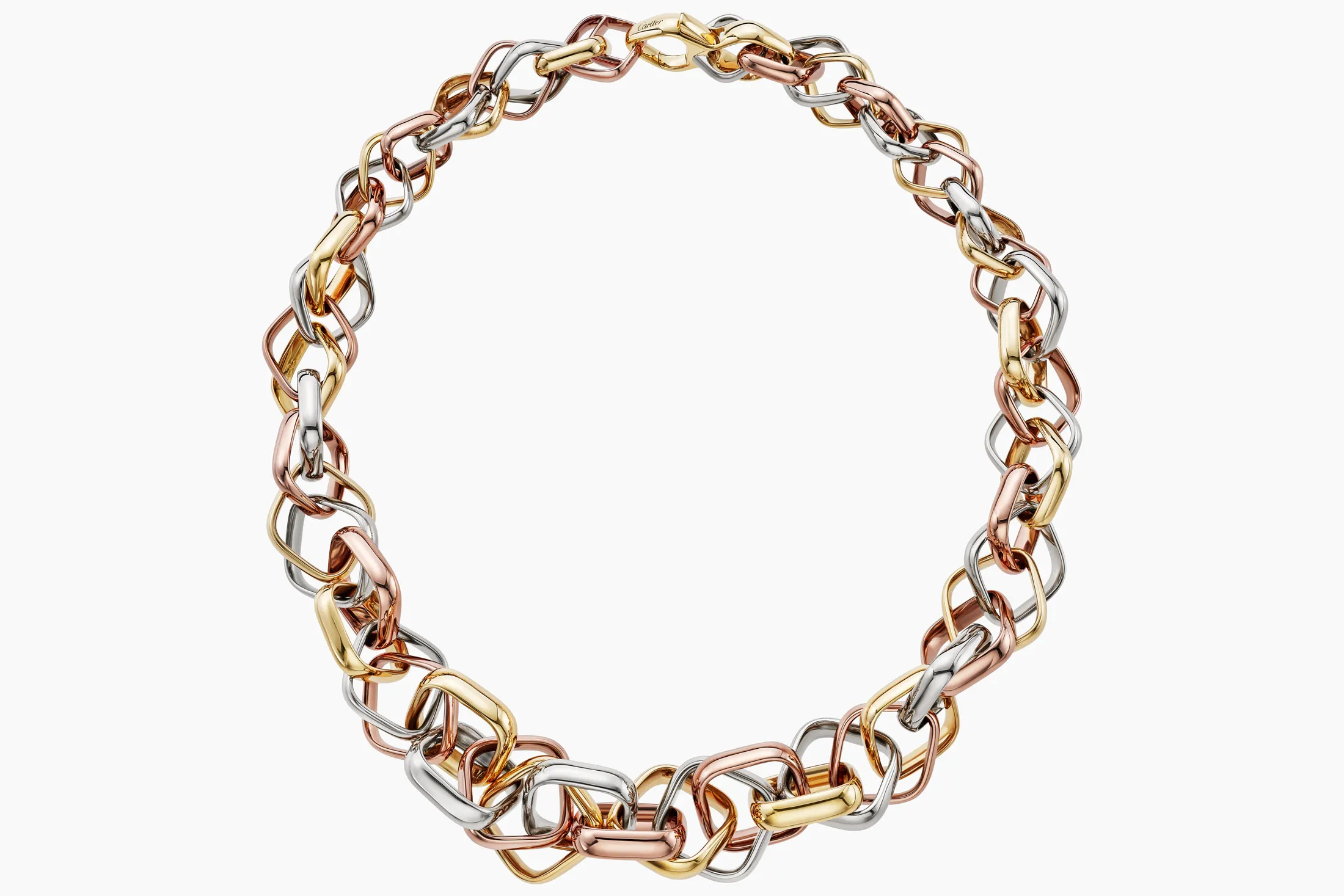 .卡地亚三重奏枕形超大项链来源:公司去年,卡地亚庆祝了其三重奏系列的100周年,这些令人羡慕的饰品由黄、白和玫瑰金交错的环组成。庆祝活动将持续到2025年,这款 戏剧性的三重奏项链($63,500)由一堆方形的18克拉金链环组成。它非常适合庆祝下一个世纪的奖金。