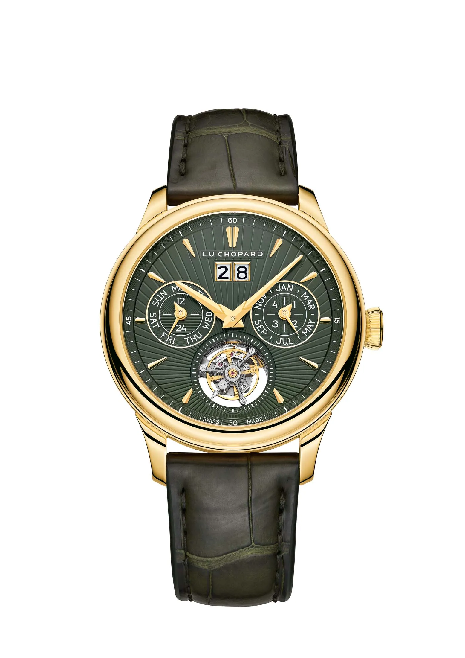 萧邦 L.U.C Flying T Twin Perpetual 手表来源:公司萧邦结合了一个永恒日历复杂功能,能够准确跟踪星期几和日期,即使跨越闰年,以及一个陀飞轮——这种稀有的振荡装置确保了超精确的计时(以及炫耀的资本)。L.U.C Flying T Twin Perpetual($184,000)在其40.5毫米的18K黄金表壳中融入了许多华丽的设计,但温和的森林绿色手工雕刻表盘使整体看起来相对低调。几乎如此。