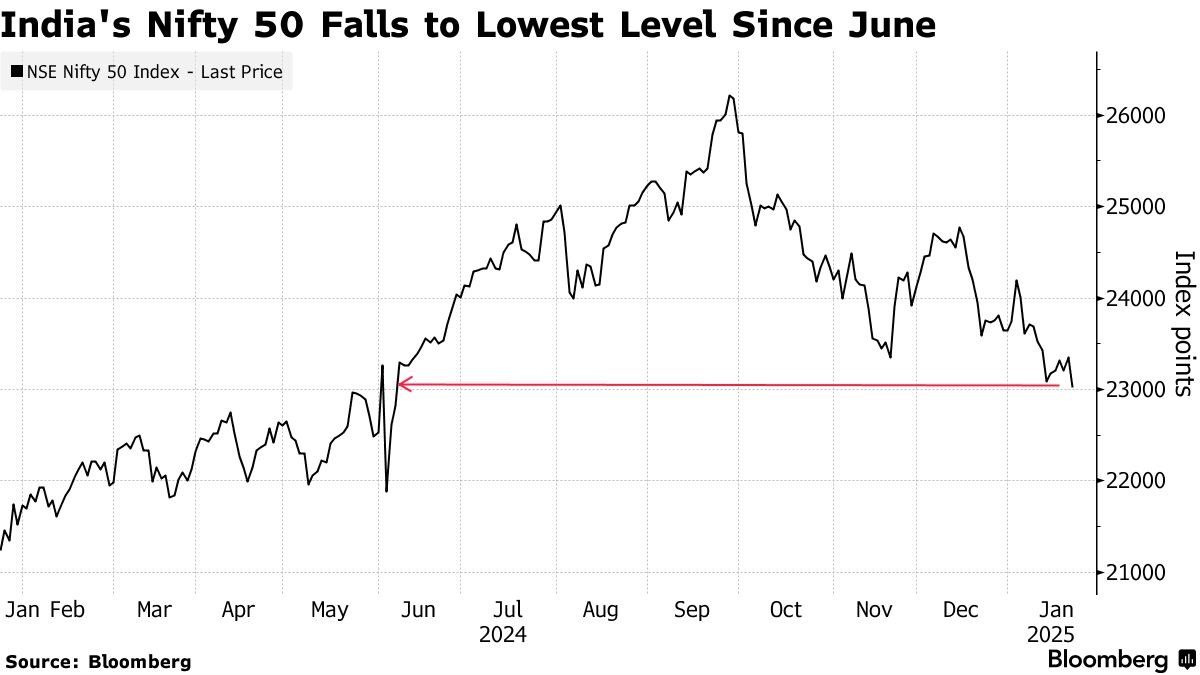 该NSE Nifty 50 指数周二下跌1.4%,至23,024.65,较九月高峰下跌超过12%。在特朗普就职后,该国的股市基准是该地区表现最差的之一,印度公司如信实工业有限公司和印度工业信贷投资银行有限公司是MSCI亚太指数的主要拖累。