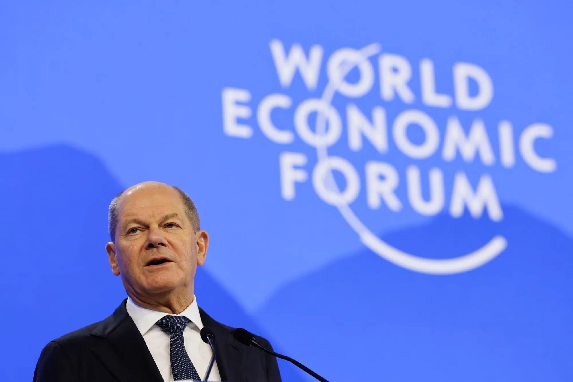 奥拉夫·肖尔茨在瑞士达沃斯的世界经济论坛上发表讲话,时间是1月21日。