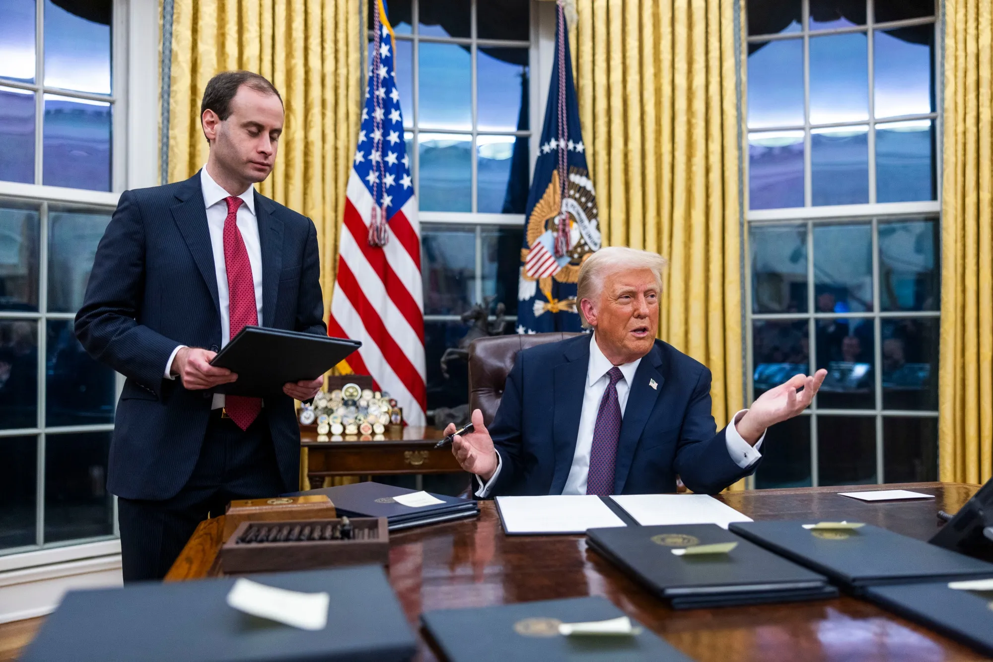 特朗普在白宫椭圆形办公室签署行政命令时发言。摄影师:吉姆·洛·斯卡尔佐/EPA唐纳德·特朗普总统表示计划在几周内对墨西哥和加拿大实施之前威胁过的关税,最高可达25%,重申他认为美国最亲近的邻国和最大的贸易伙伴正在让无证移民和毒品涌入美国。“我们考虑对墨西哥和加拿大征收25%的关税,因为他们允许大量人员”越过边界,特朗普在椭圆形办公室回答记者提问时说道。“我认为我们将在2月1日实施。”