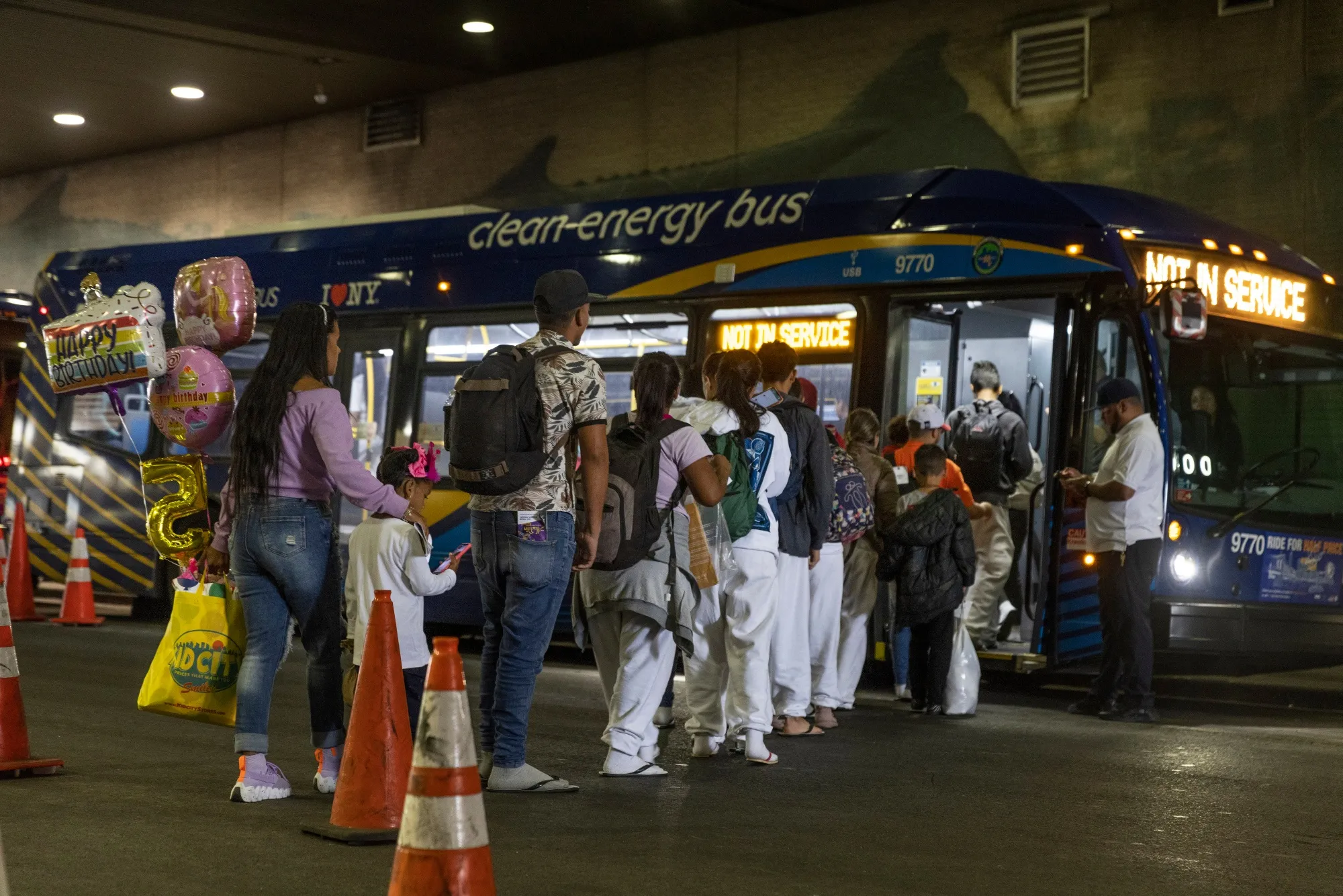 移民在2023年乘坐巴士从德克萨斯州前往纽约后,登上城市公交车前往避难所接待中心。