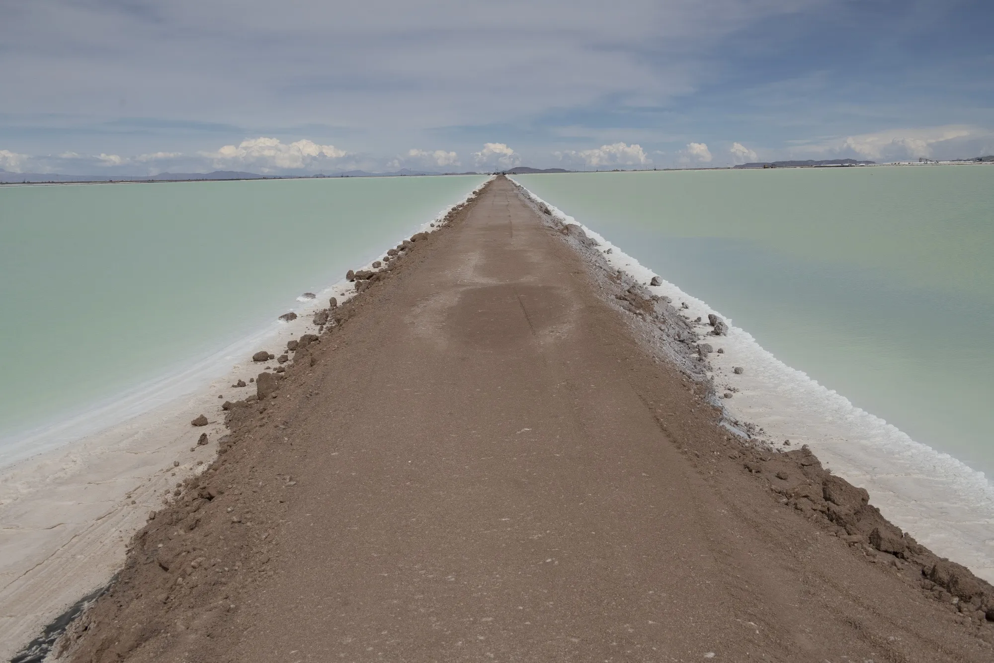 在玻利维亚波托西的乌尤尼盐沼,一个工业蒸发池之间的道路。摄影师:卡洛斯·贝塞拉/彭博社玻利维亚正在加大努力开发世界上最大的锂矿储备,尽管价格低迷且立法者和公民团体的反对声音日益增强,仍在与新投资者洽谈建立加工厂的协议。