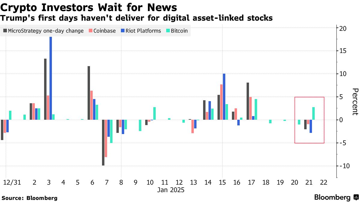 在特朗普的第一天 缺乏 任何期待已久的政策举措来支持数字资产后,加密货币和与加密相关的股票的波动相对平静。 MicroStrategy Inc. 的股票早盘下跌了多达7.3%,但随后收复了大部分跌幅,并在小幅涨跌之间波动。与此同时,Coinbase Global Inc. 也在红绿线上徘徊,Hive Digital Technologies Ltd. 和加密矿商 Riot Platforms Inc. 的股价略有下跌。比特币上涨超过3%,交易价格约为106,000美元。