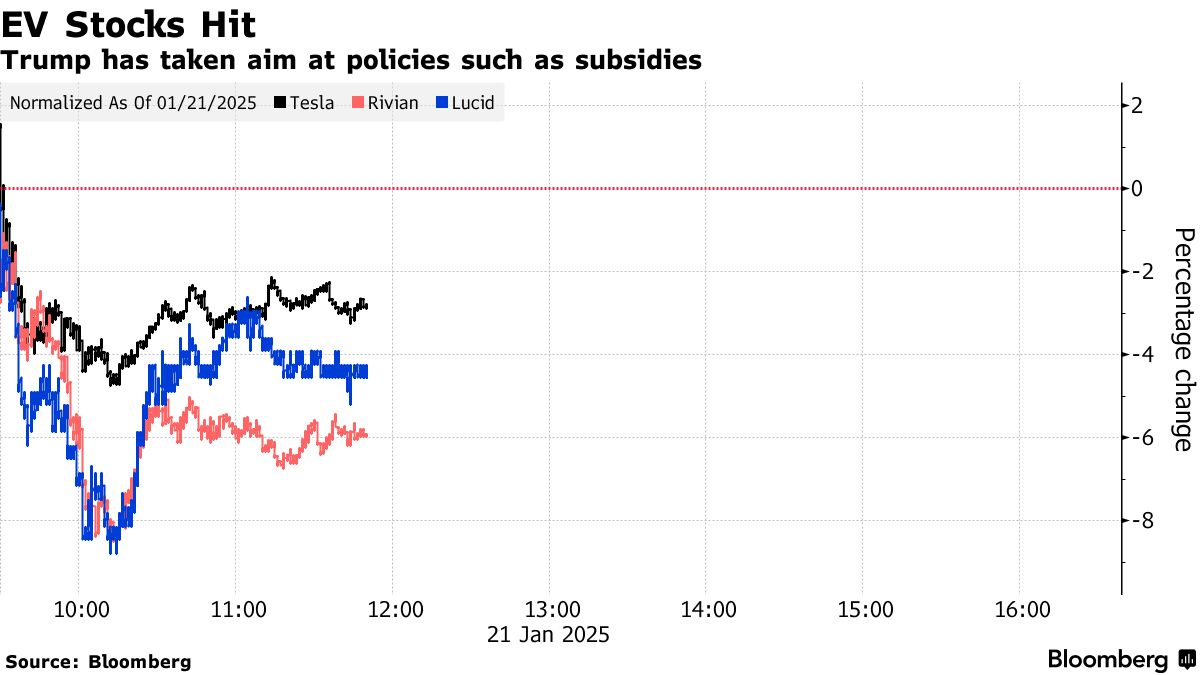 具体来说,特朗普命令他的政府考虑取消补贴和有利于电动车的政策,这对埃隆·马斯克的公司造成了压力。他还宣布计划在2月1日前对墨西哥和加拿大征收25%的关税,并在他周一的就职演说中承诺将美国宇航员送上火星。