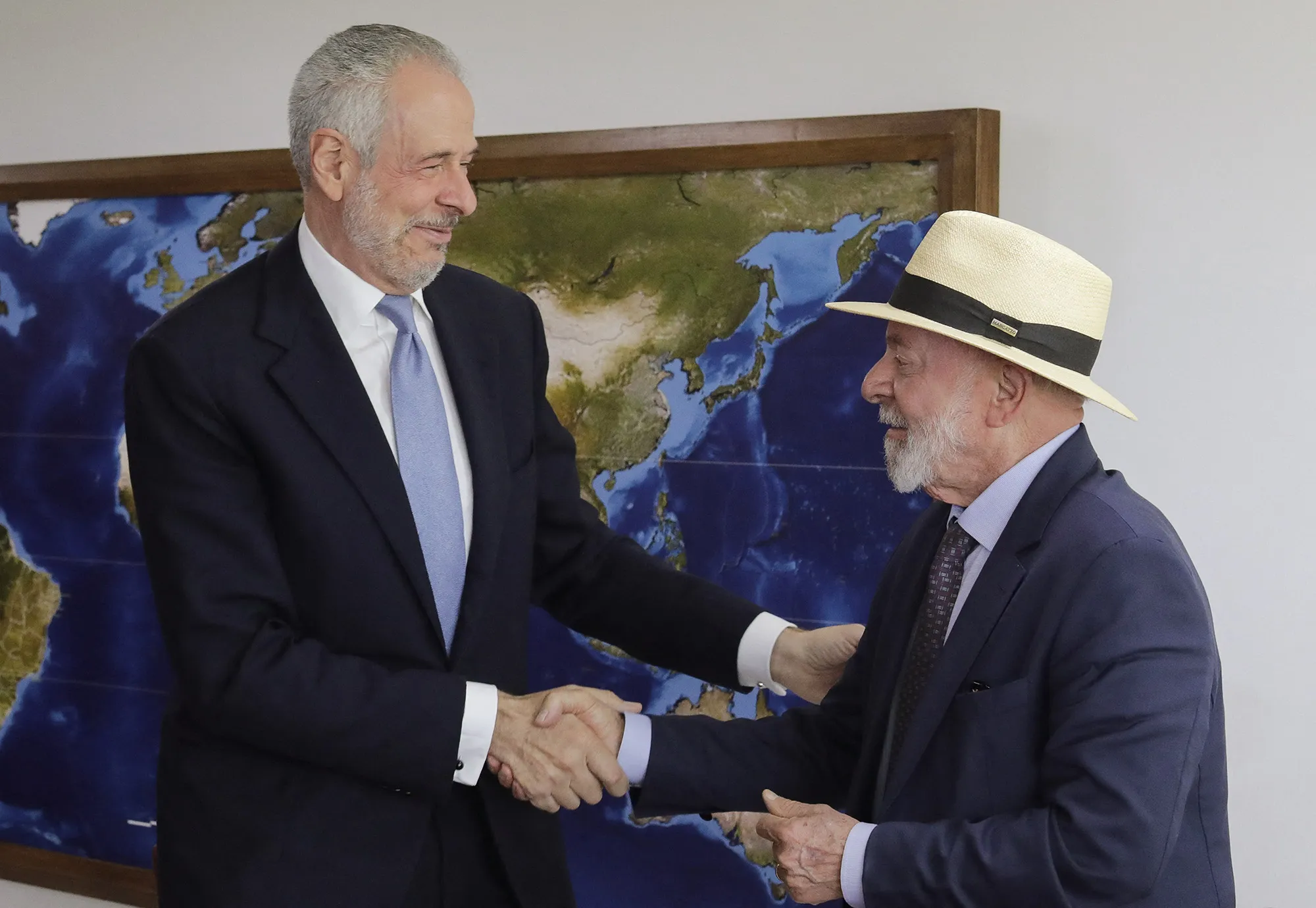路易斯·伊纳西奥·卢拉·达·席尔瓦(右)在1月21日于巴西利亚的普拉纳托宫与安德烈·科雷亚·杜·拉戈握手,宣布他为联合国气候大会COP30的主席。