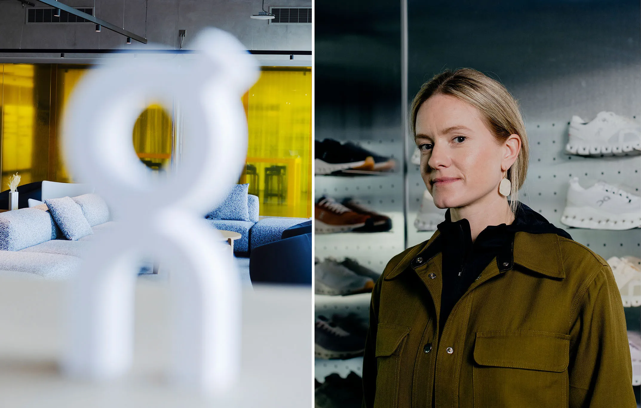 奥尔森,On公司的商业总监,在波特兰的办公室。照片:威尔·松田为彭博商业周刊拍摄在回家的路上,霍夫曼从高速公路上驶出,带着他的同事们来到One Bowerman Dr.,这是耐克全球总部在比弗顿的入口。欧洲人下了车,欣赏着广阔而宏伟的空间,这是经过数十年满足运动员需求和公众偏好的巧妙成果。耐克,曾经也是一个小众的跑步品牌,不仅扩展到了其他运动;它已成为一个文化偶像,与那些现在装饰着其校园建筑的传奇人物同在:皮特·萨姆普拉斯、老虎·伍兹和迈克尔·乔丹。