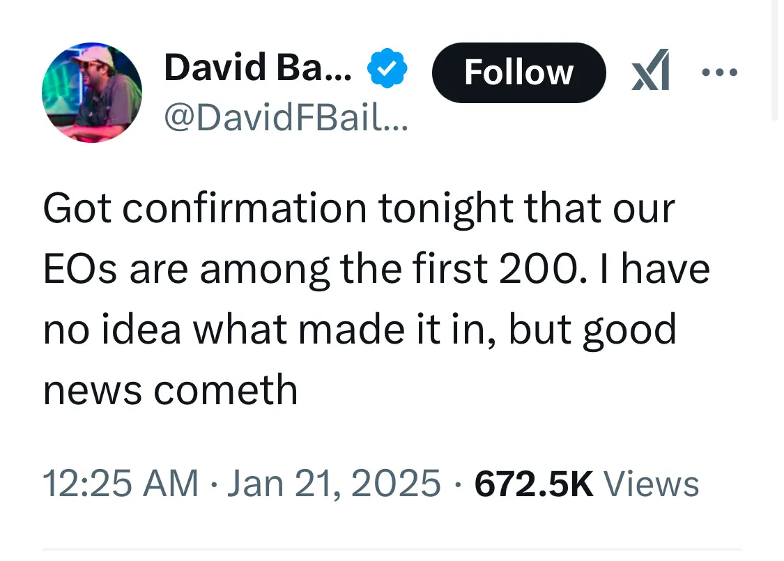 数字资产爱好者在唐纳德·特朗普于纳什维尔的比特币会议上发表轰动一时的七月演讲后的几个月里,预先庆祝他对该行业的承诺:如果当选总统,他将解雇他们的对手加里·根斯勒;创建一个联邦比特币储备;并且让加密货币再次伟大。然而根斯勒辞职,自就职日生效——这一天有一系列行政行动,但没有一项与加密货币或比特币有关。也没有任何加密货币高管出现在与马克·扎克伯格、杰夫·贝索斯、桑达尔·皮查伊和埃隆·马斯克并肩的主座上。