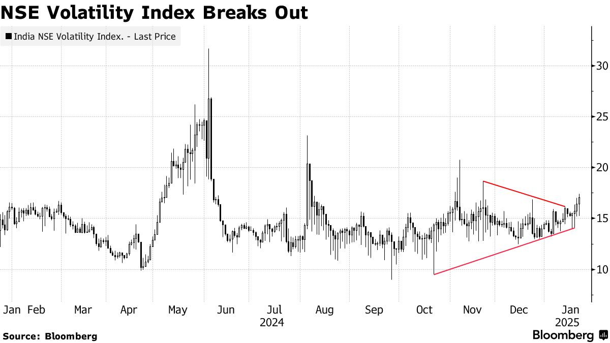 在特朗普总统就职不到24小时内,印度股市感受到的震动超过了大多数亚洲同行。NSE波动率指数,通常被称为恐惧指数,已经延续了四天的上涨,达到了自八月份以来的最高水平。尽管波动性通常是均值回归的,但历史表明其范围可能会随着时间的推移而变化。例如,在2021年中期到2023年初之间,恐惧指数持续交易在16以上,标志着一个持续的高不确定性时期。