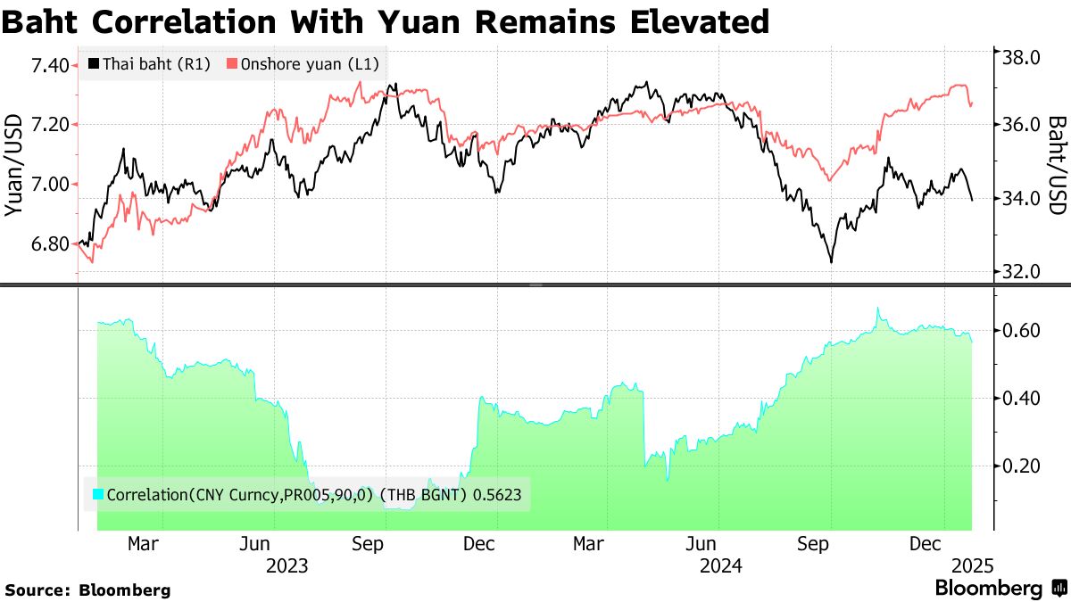 MUFG银行有限公司的货币策略师劳埃德·陈表示:“特朗普总统上任第一天没有加征关税,人民币走强,以及黄金价格上涨,可能都促成了近期泰铢的强势。”
