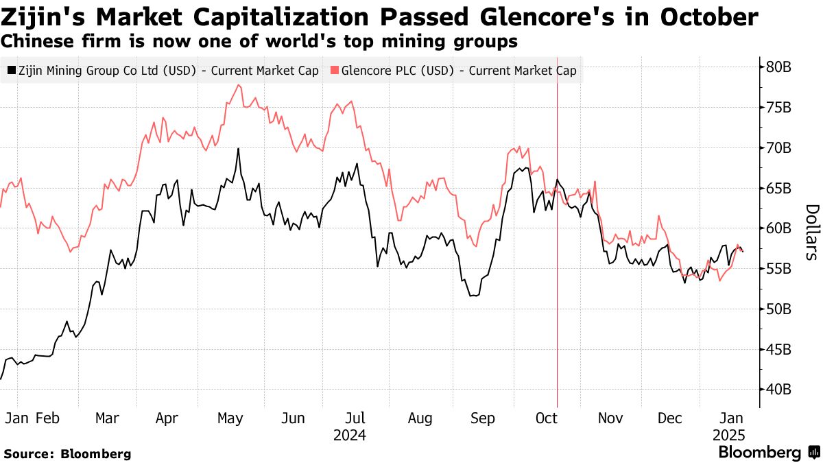 2024年的净收入增长了52%,达到了320亿元人民币(44亿美元),该公司 在周二的初步业绩声明中表示。在去年大幅提高铜产量并享受创纪录的黄金价格后,紫金的市值现在大致与嘉能可相当。