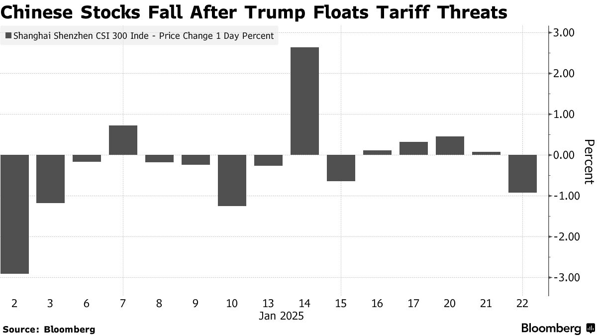 特朗普在回到办公室的第二天扩大了对中国的关税威胁。周三,在特朗普最新评论后,中国股市下跌,岸上基准CSI 300指数录得五天来的首次下跌,而恒生中国企业指数成为亚洲表现最差的指数。