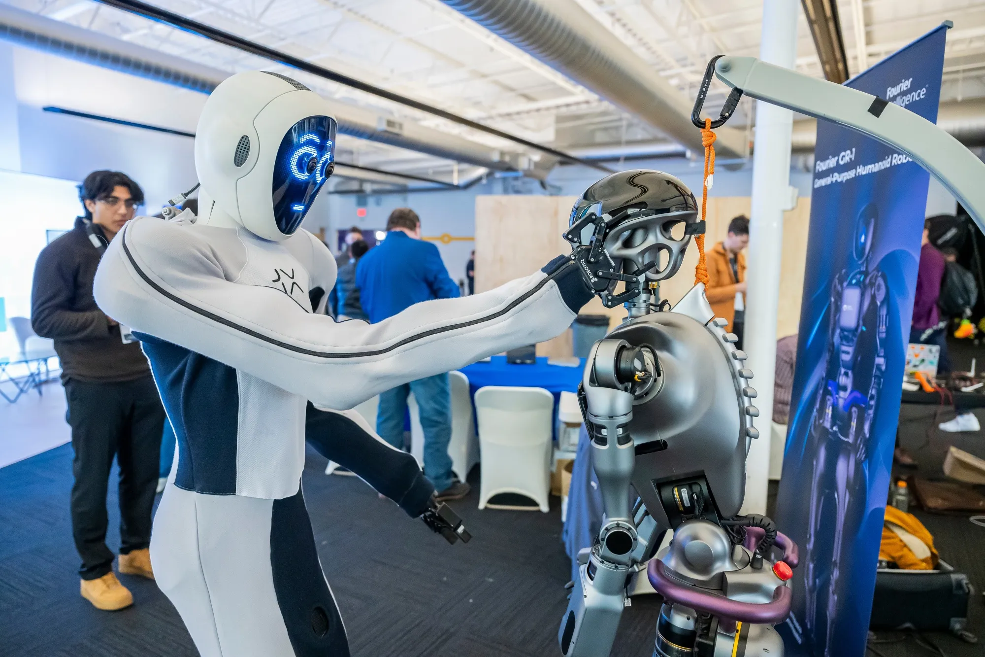 来自1X Technologies的EVE类人机器人(左)和来自傅里叶的GR-1类人机器人,出现在加利福尼亚州山景城的类人机器人峰会上。摄影师:大卫·保罗·莫里斯/彭博社### 全球必读