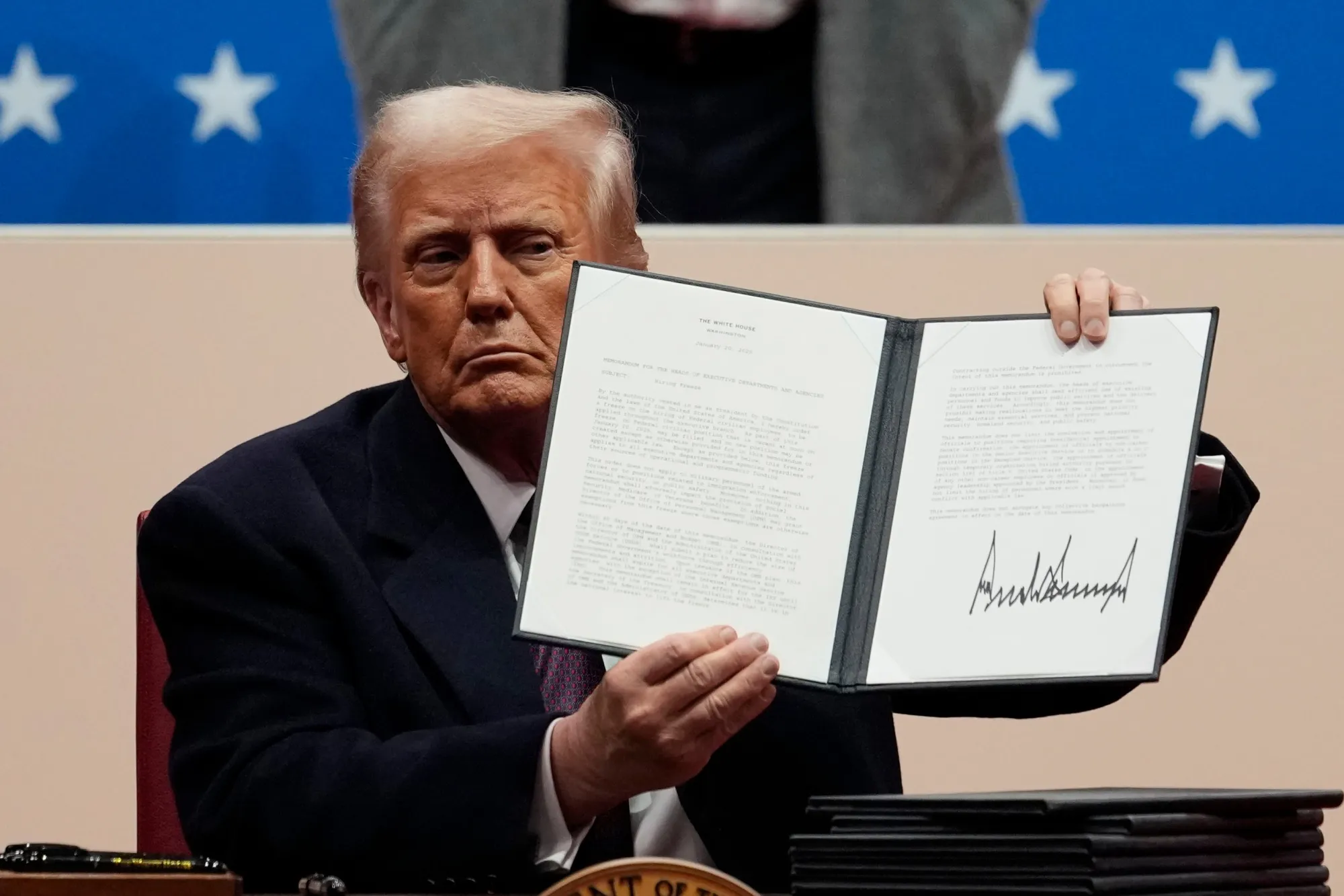 美国总统唐纳德·特朗普持有一份签署的行政命令。照片:Kent Nishimura/Bloomberg在过去两年中,拜登政府在人工智能方面保持了平衡。采取措施确保美国在技术发展上领先于中国,同时试图解决一些潜在风险。