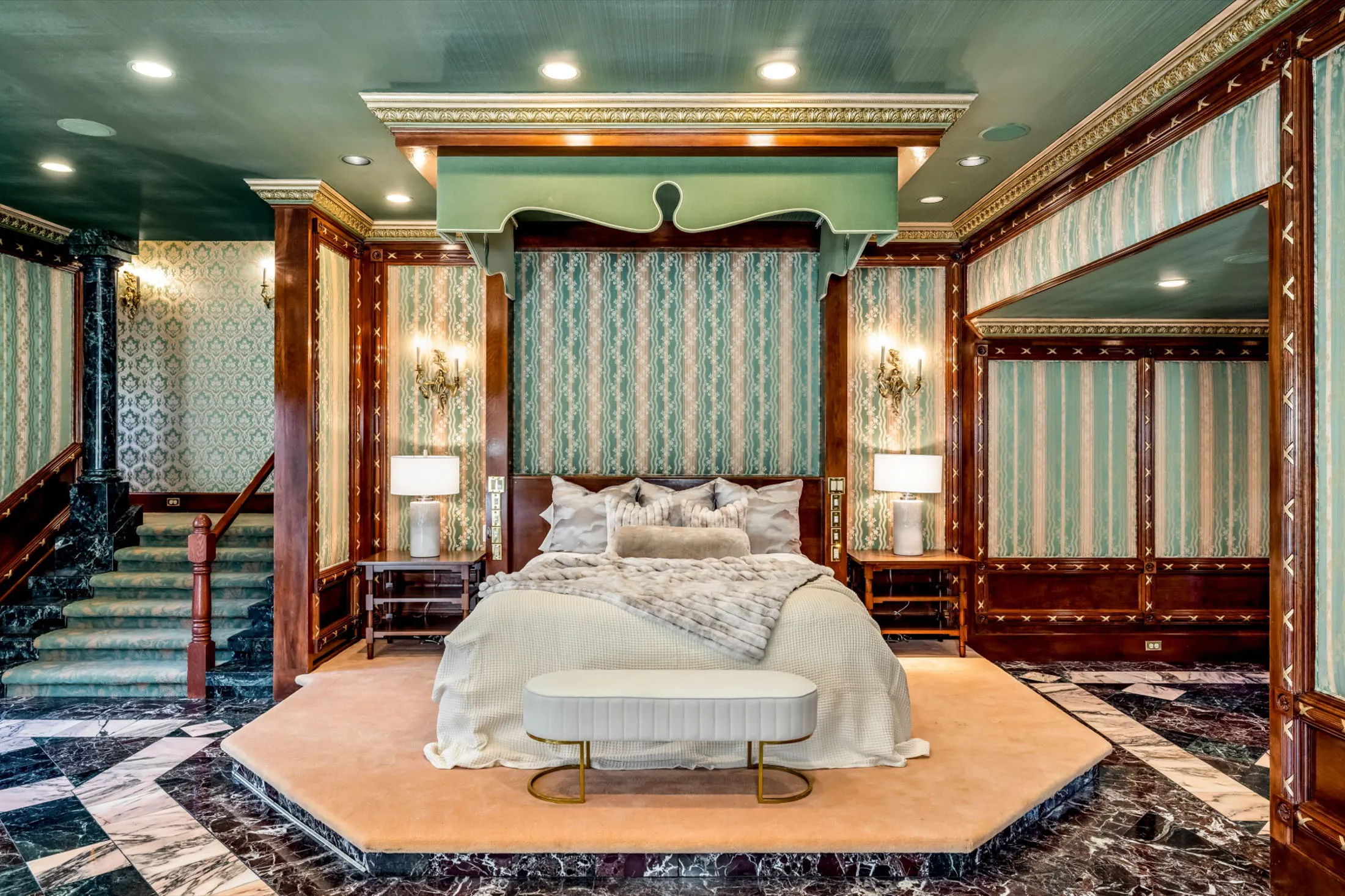 主卧室的绿色调。来源:苏富比国际房地产哈桑还想要一个室内游泳区,因此他安装了一个带绿色大理石和瓷砖的游泳池,以及一个他在四季中都使用的桑拿,宣传其健康益处。游泳池旁有两个更衣室和储物柜,还有一条专用楼梯直接通往主卧室套房和水疗区。