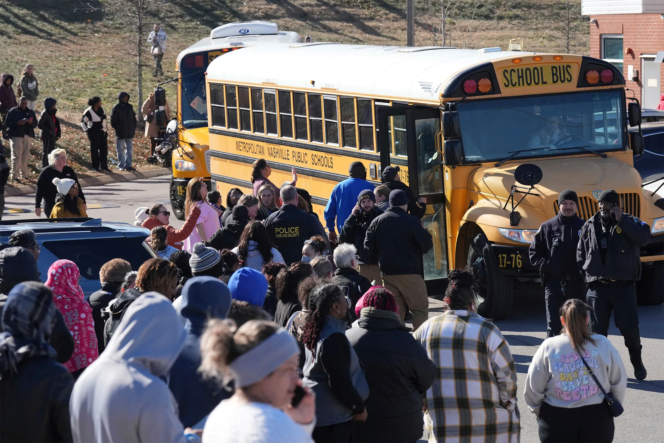 学校巴士在纳什维尔安提阿克高中发生枪击事件后抵达统一地点,时间是1月22日。