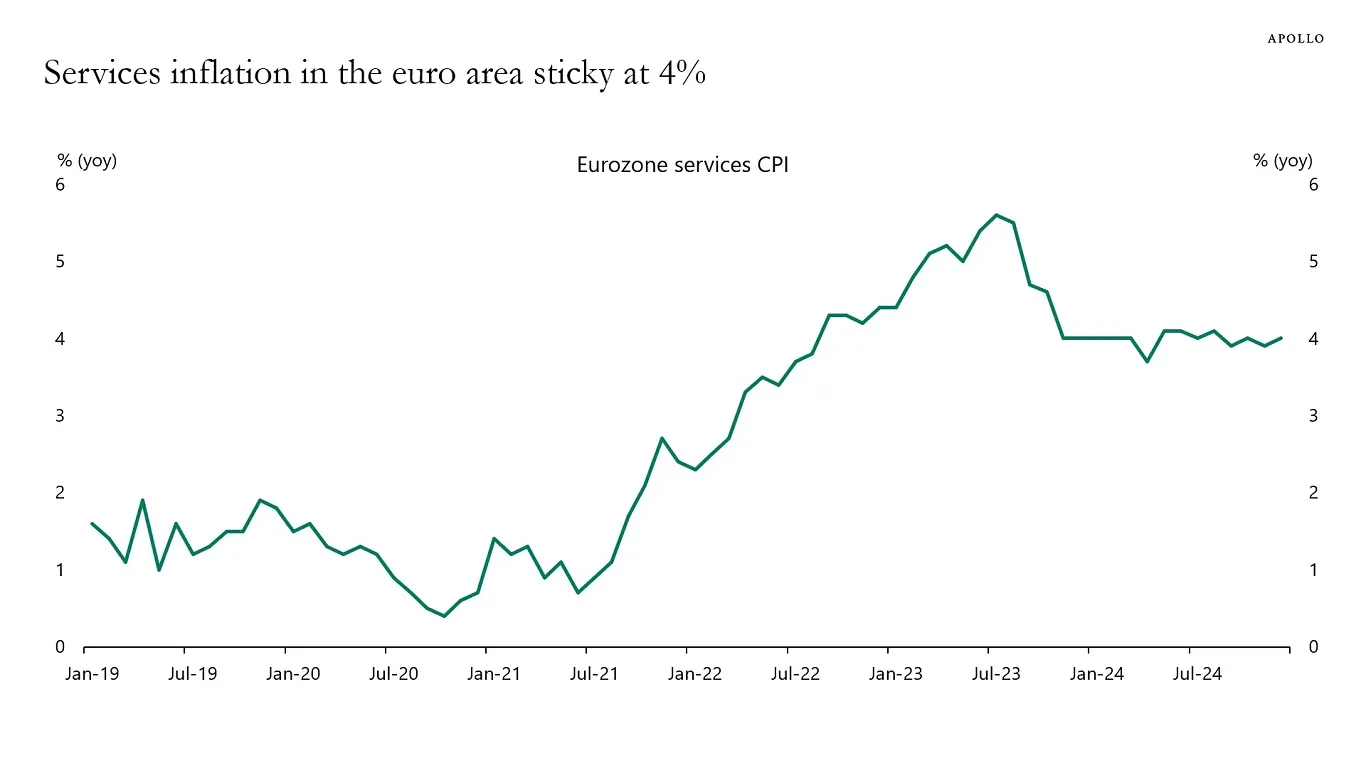 我认为市场有些过于乐观。全球范围内,通货膨胀是一个问题,即使在增长乏力或之前曾主导的通缩的发达经济体中也是如此。以欧洲为例。阿波罗全球的首席经济学家托尔斯滕·斯洛克本周早些时候指出,欧元区的服务业通货膨胀为4%。而且它是粘滞的,这意味着在疫情后通货膨胀冲击后,它在这个水平上保持了很长时间。