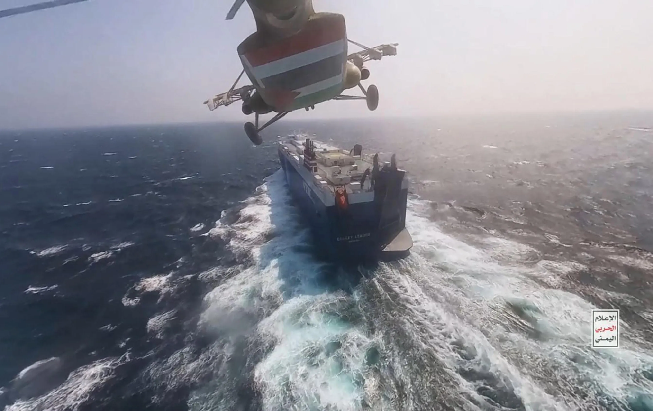 这张从视频中截取的手稿显示,2023年11月,胡塞武装在也门霍代达附近的红海中接管了银河领袖货船。来源:Getty Images白宫在周三晚上的一份事实清单中表示:“由于拜登政府的软弱政策,胡塞武装对美国海军军舰进行了数十次攻击,对合作国的民用基础设施进行了多次攻击,并袭击了商业船只。”