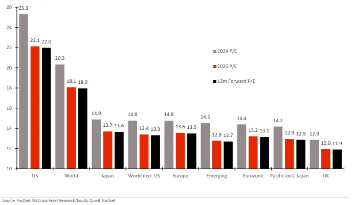 那么,为什么会有复苏和基金经理的突然兴趣呢?很大程度上是因为欧洲股市 notoriously 便宜。这张来自法国外贸银行的图表比较了市盈率,显示欧洲便宜得多: