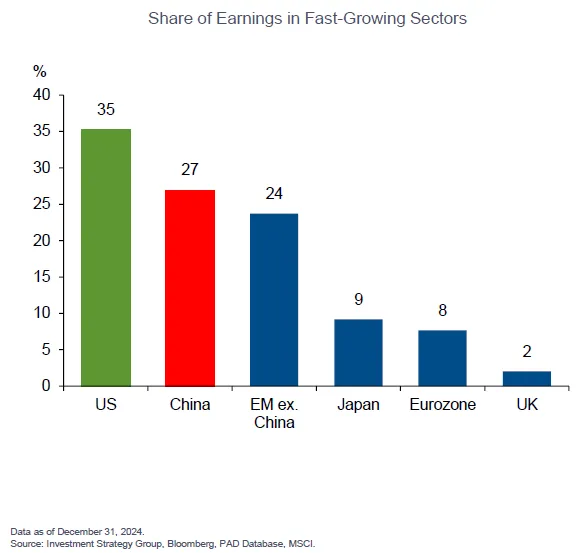 然而,这可能被夸大了。欧洲必须面对在当前引领全球经济增长的行业中缺乏大型竞争性公司的问题。来自高盛投资策略组的这张图表显示,欧元区此类公司的份额与中国或美国相比微乎其微——尽管至少该地区在快速增长的行业中拥有比英国更多的参与者。市场整体的盈利倍数看起来便宜是很自然的: