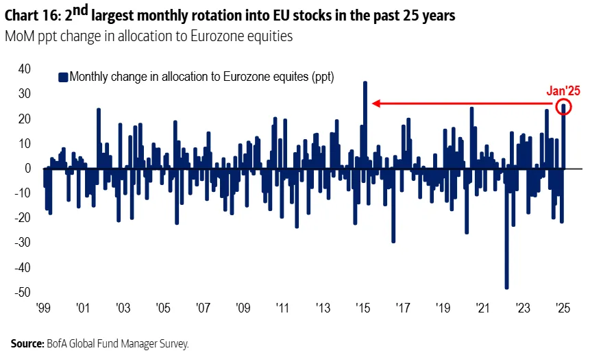 与 2024年中期相比,最新的全球基金经理月度调查由美国银行公司进行。显示出对该地区的惊人转变。受访者对欧洲的权重在2015年以来的任何一个月中都上升最多,并且是历史上第二高。这项调查是在特朗普上任之前进行的,早于他最初未能对欧盟施加新关税所带来的乐观情绪: