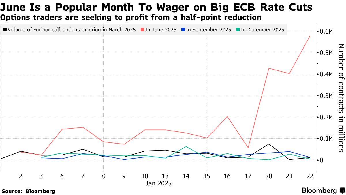 根据彭博社汇编的数据,这些押注主要集中在将于6月到期的三个月Euribor融资利率的期权上,并且自年初以来迅速积累。