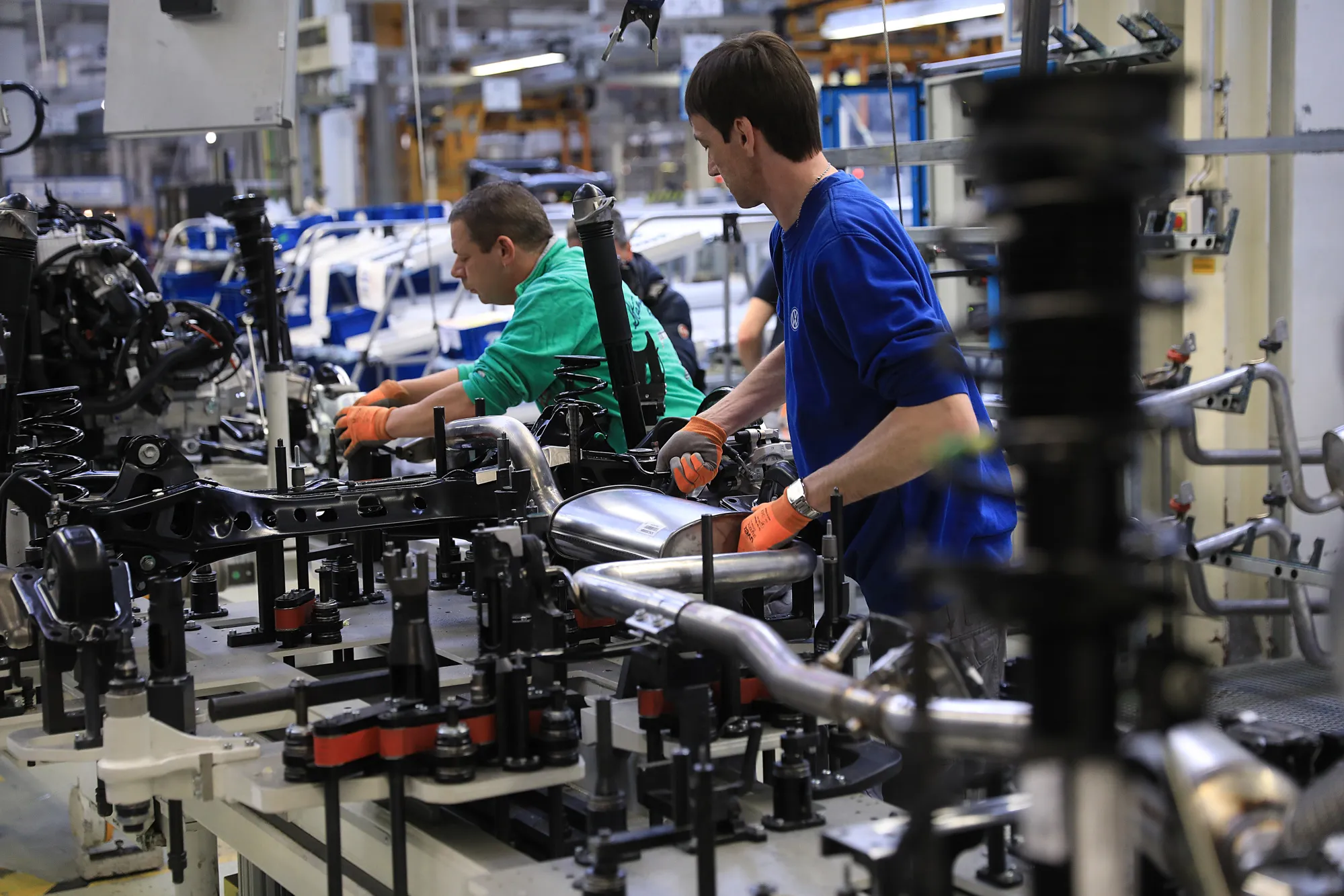 员工在德国埃姆登的大众汽车工厂内安装排气系统。