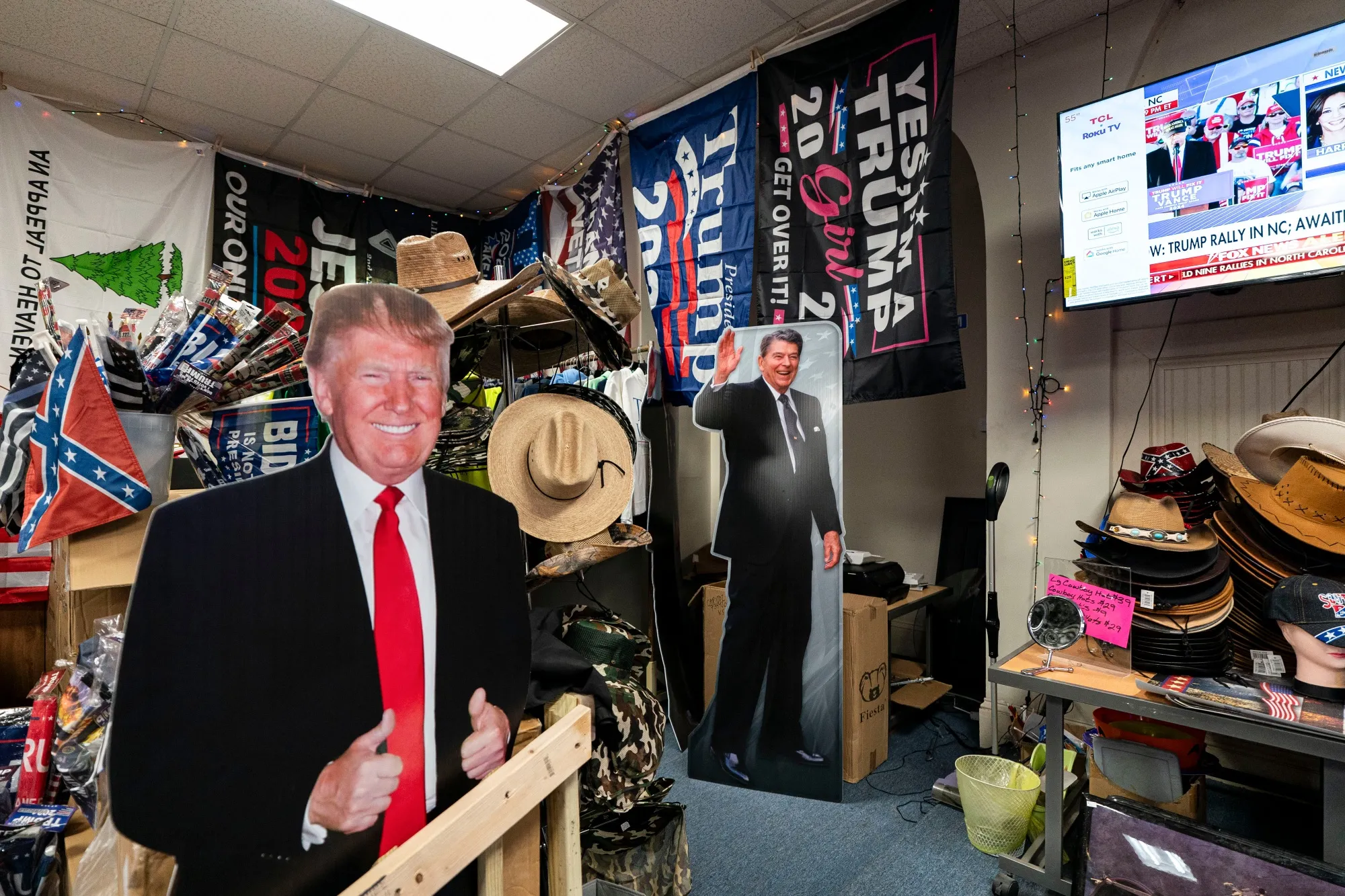出售的前美国总统唐纳德·特朗普和前美国总统罗纳德·里根的纸板人偶,位于弗吉尼亚州布恩斯米尔的特朗普城美国商品店。
