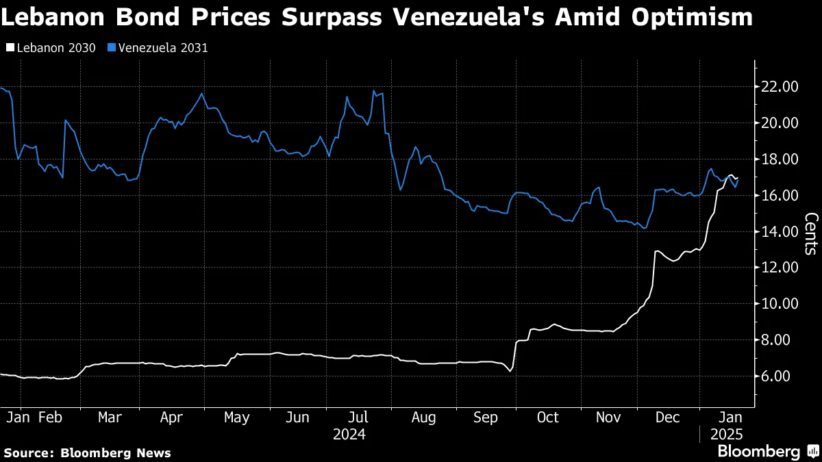 黎巴嫩的价格在过去三个月中已经翻了一番。摩根大通证券的交易员称委内瑞拉的债券为他们“2025年最大的信念交易”。