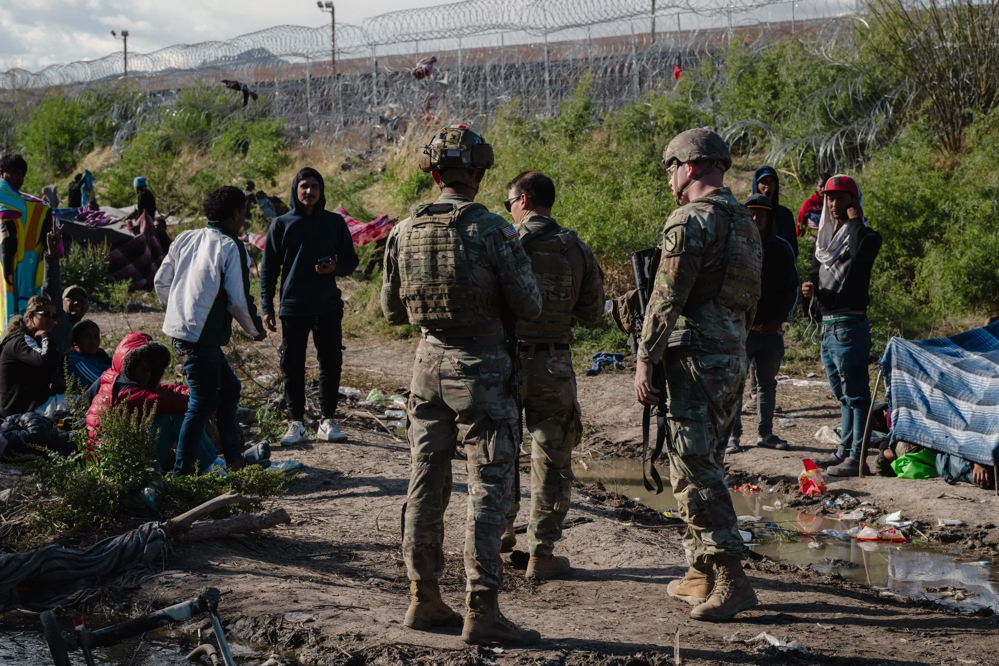 德克萨斯州国民警卫队的成员在德克萨斯州埃尔帕索的移民营地中走动。