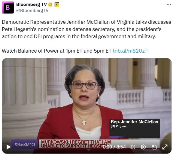 今天在彭博电视台的 权力的平衡 早间版中,主持人乔·马修和凯莉·莱因兹采访了来自弗吉尼亚州的民主党代表詹妮弗·麦克莱伦,讨论特朗普结束政府DEI项目的行动以及总统政策对军队的影响。