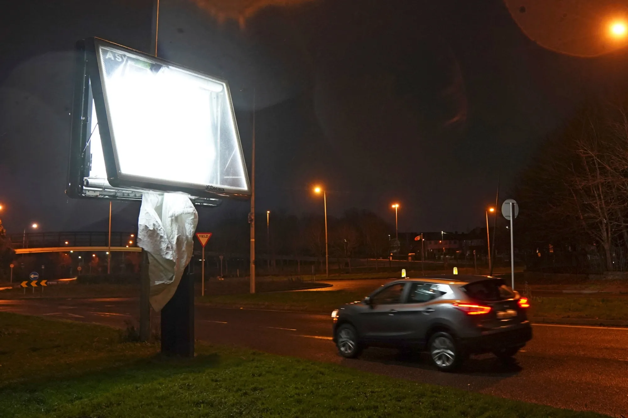 在1月24日的风暴埃欧温期间,都柏林的一块受损广告牌。摄影师:布赖恩·劳利斯/PA飓风强度的风在周五早晨袭击了爱尔兰和英国,导致数千个家庭和企业停电,并扰乱了该地区的交通。