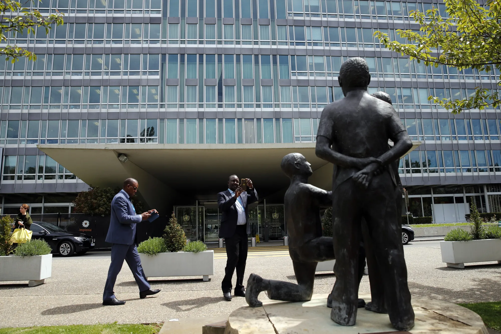 人们在日内瓦世界卫生组织总部大楼前拍摄雕塑的照片。
