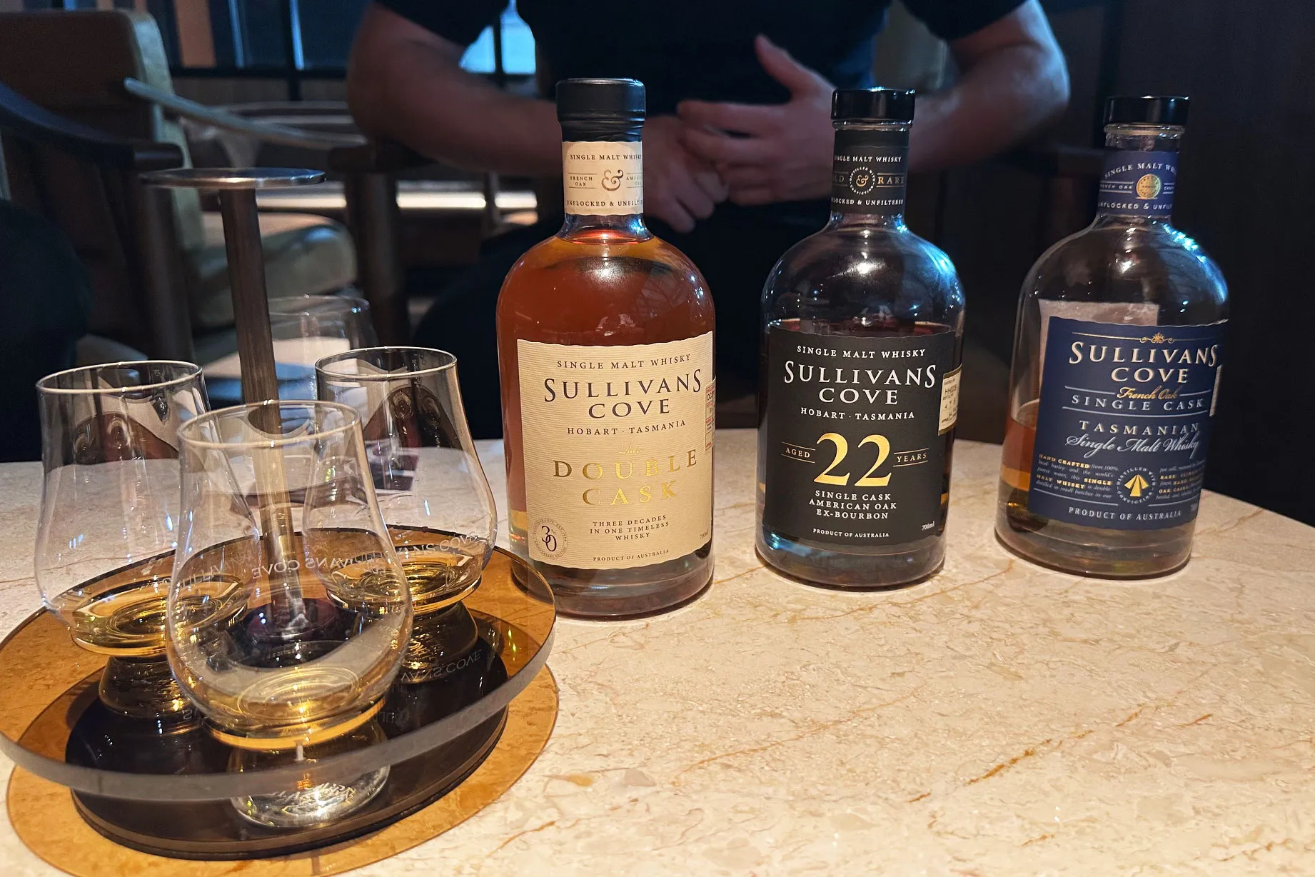我预定了一场品鉴,我的航班以一杯港酒成熟的塔斯曼桶开始。这款特别为酒店瓶装的九年单一麦芽威士忌展现了辛辣的、可可灵感的干燥感。我的向导详细讲述了苏格兰和塔斯马尼亚之间的相似之处,这使得两地都能进行最佳的威士忌生产。除了潮湿和温和的气候——非常适合成熟——这个地方还拥有地球上最纯净的水和空气。因此,它的谷物也异常出色且丰富。