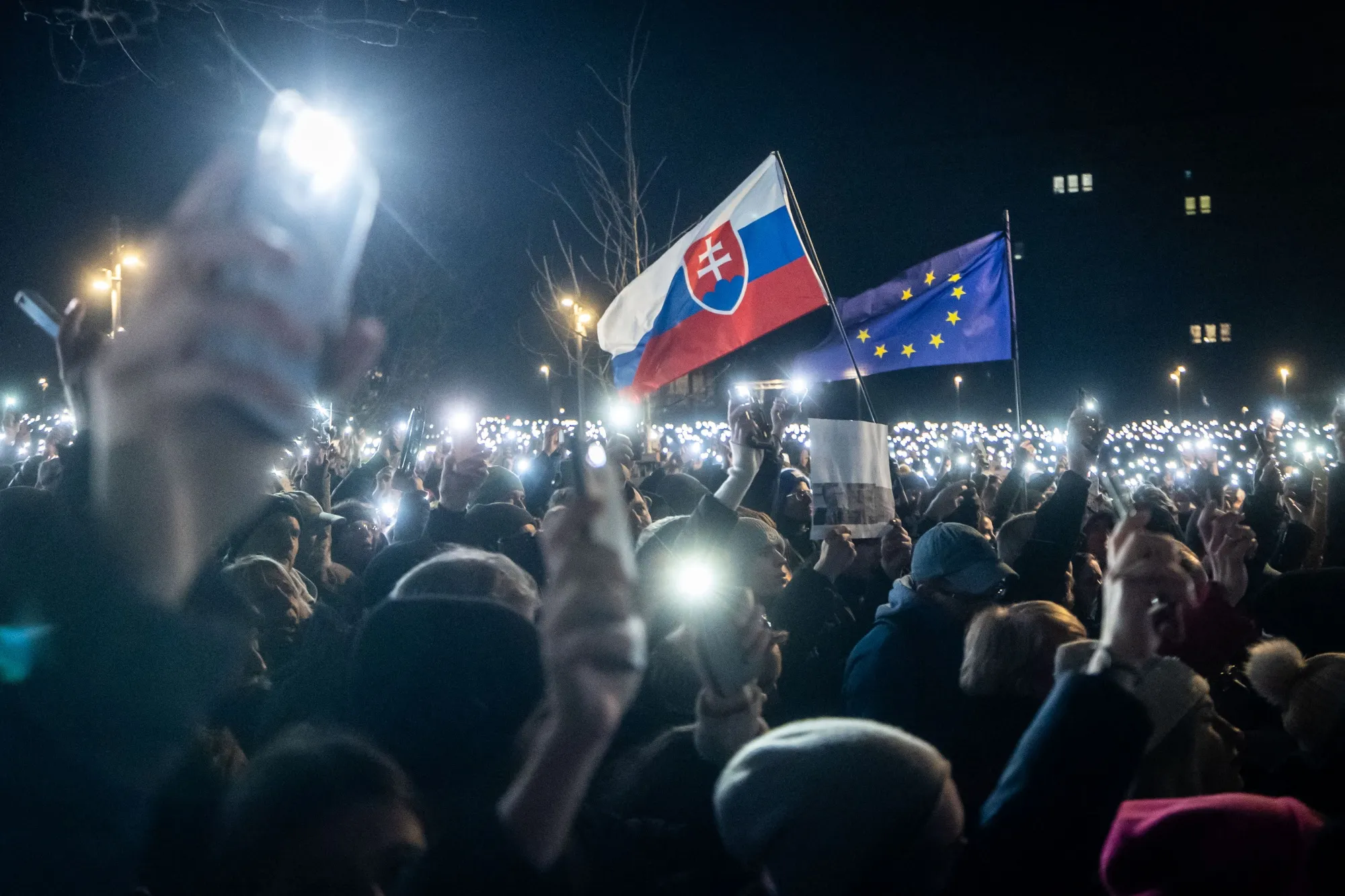 抗议者在斯洛伐克布拉迪斯拉发举行的反政府抗议活动中举起灯光和欧盟国旗,时间是1月24日。