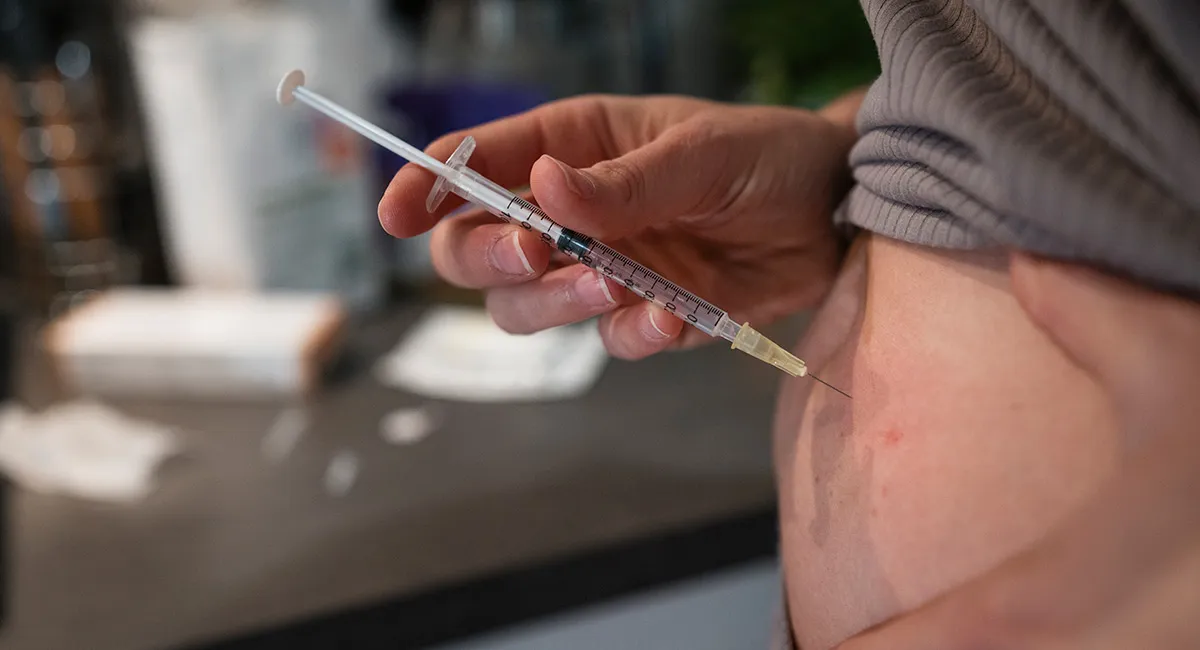 一名女性正在给自己注射用于生育治疗的激素疗法注射剂,包括将卵子收集到她的腹部。摄影师:SolStock/Getty Images### 明天你需要知道的事情