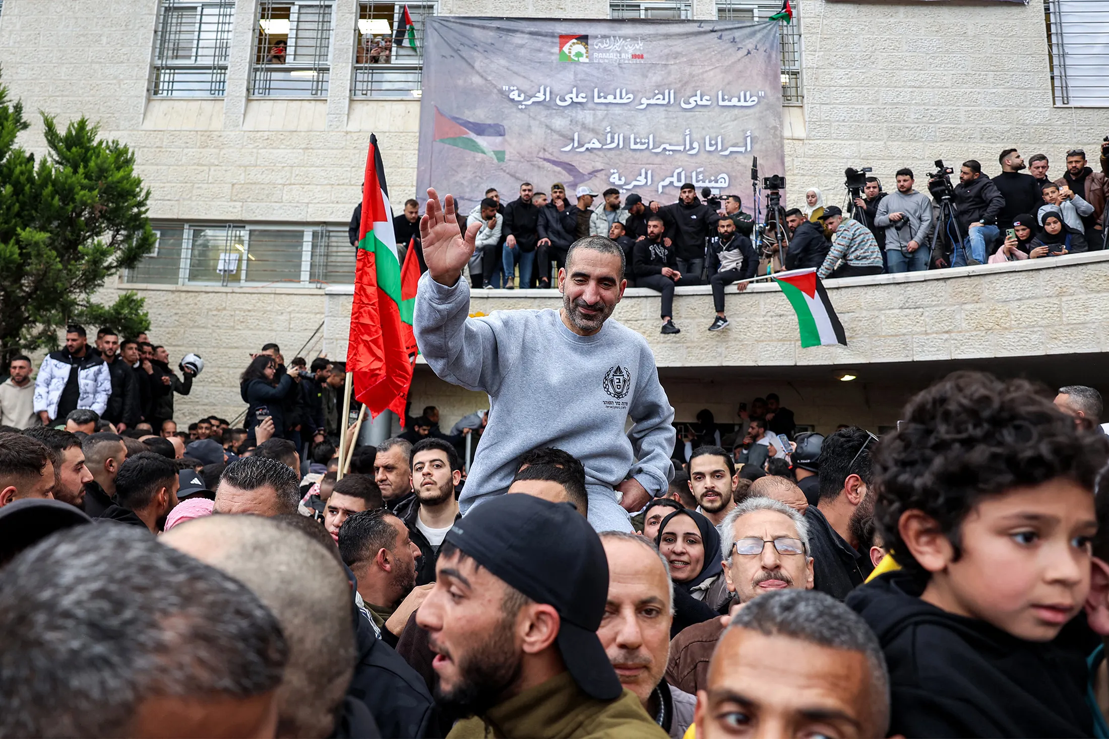 1月25日,来自以色列释放的巴勒斯坦囚犯在约旦河西岸拉马拉抵达时被人们抬着。