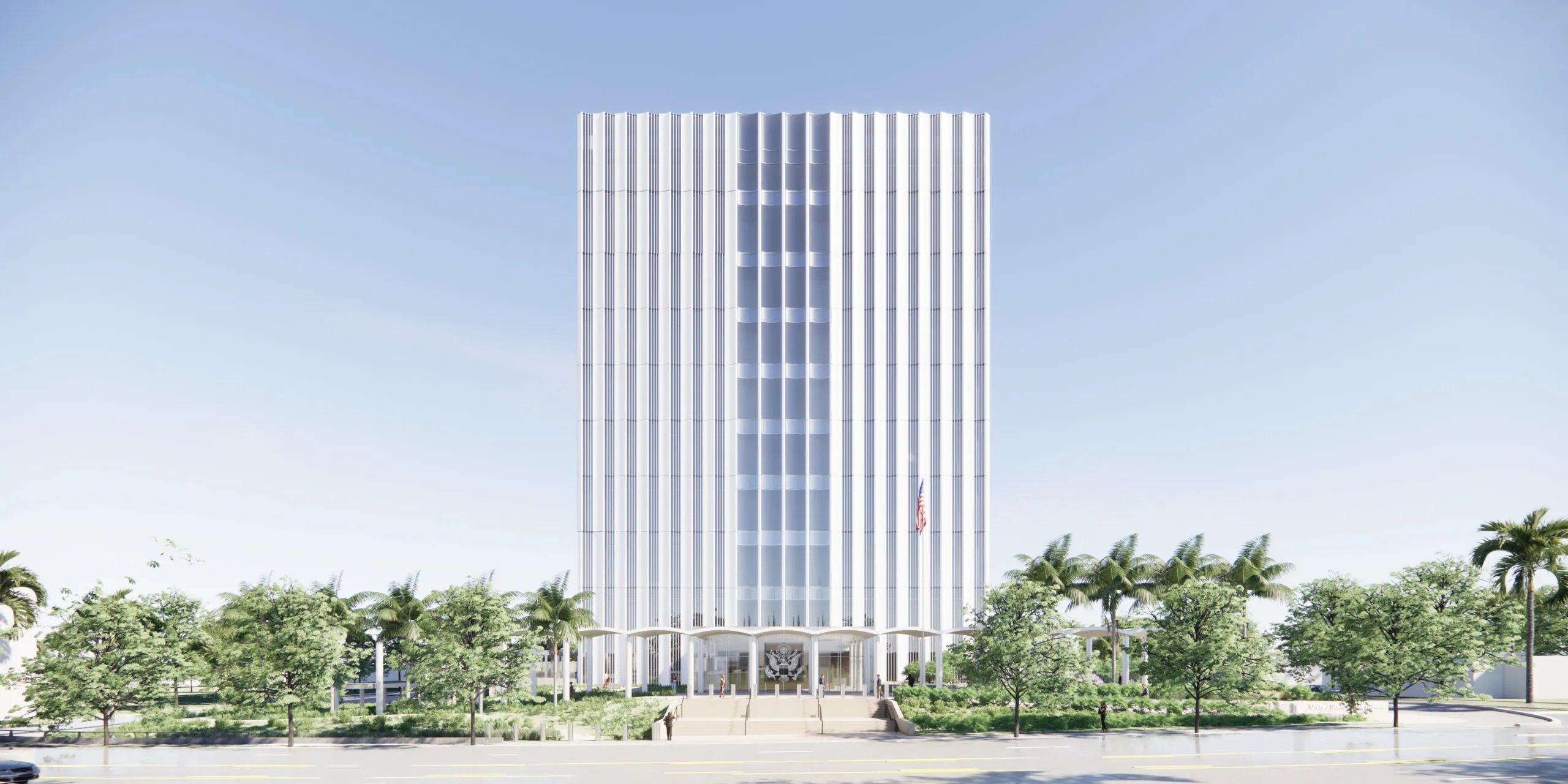 在佛罗里达州劳德代尔堡,另一项传统任务的特朗普第一任期项目也在建设中:一座价值2.45亿美元的联邦法院。全球公司SOM以一种采用古典比例和凹槽柱的法院设计赢得了该项目,但使用现代材料和光滑的饰面。