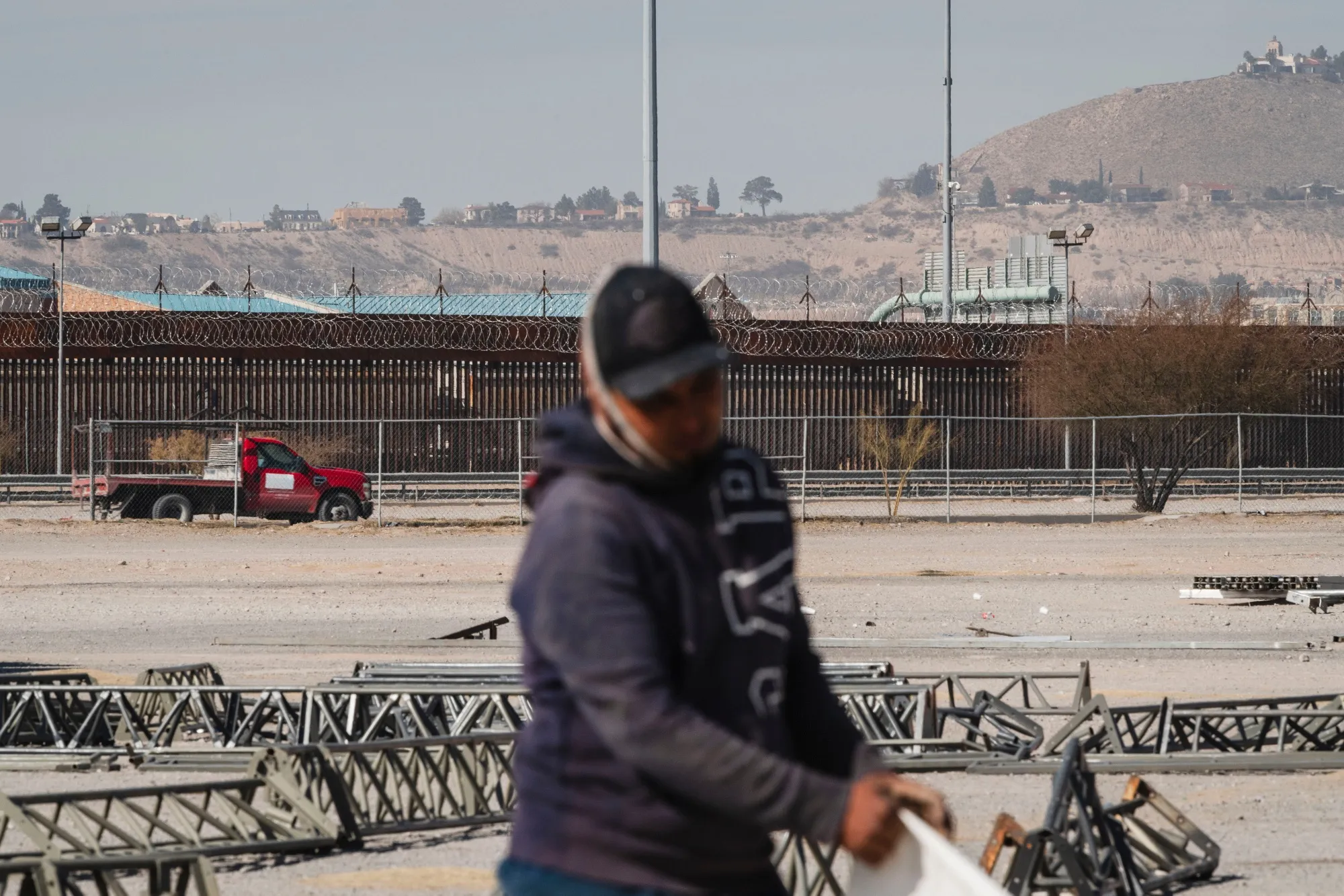 一名工人在墨西哥奇瓦瓦州的华雷斯市为大规模驱逐做准备,组装临时避难所。
