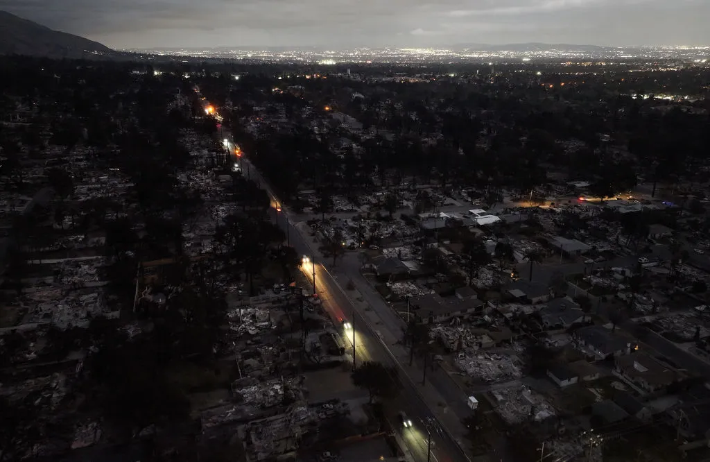 埃顿火灾中被烧毁的房屋的鸟瞰图,正值阿尔塔迪纳地区持续停电。